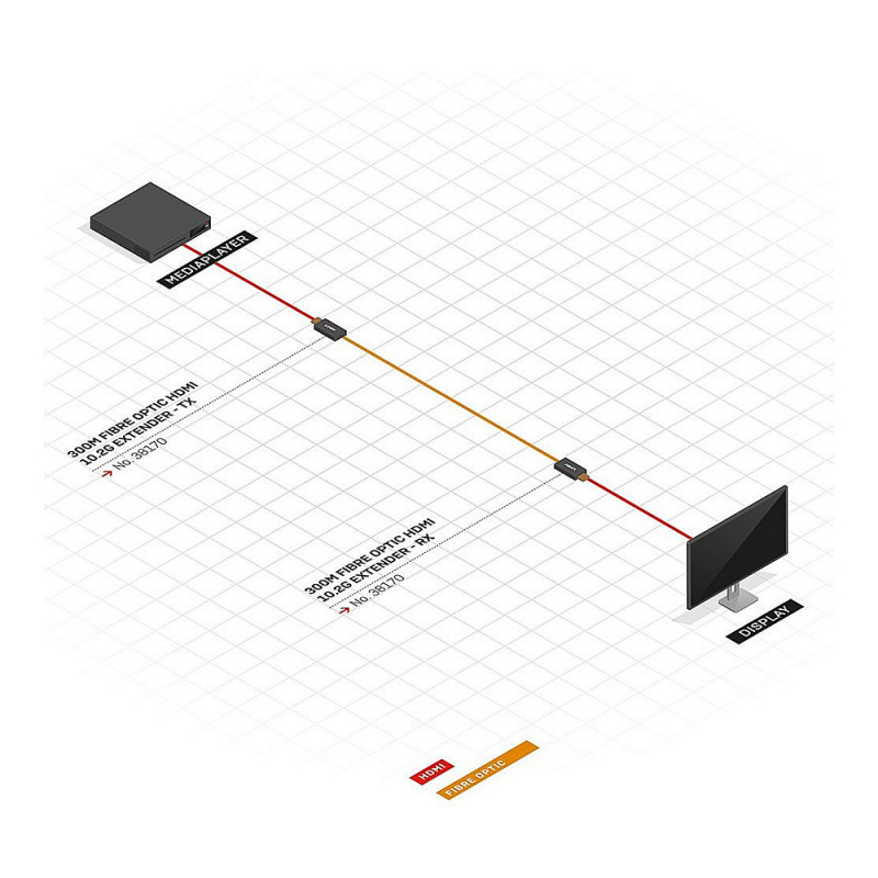 The extender system comprises two modules, a transmitter and a receiver, which are connected directly to both the HDMI source and display. This allows each device to be connected to a range of source devices including media players and Blu-ray players to display monitors and Tvs. The modules are then connected together using a single, standard LC duplex single mode fibre cable of up to 300m in length (fibre optic cable is not included)."