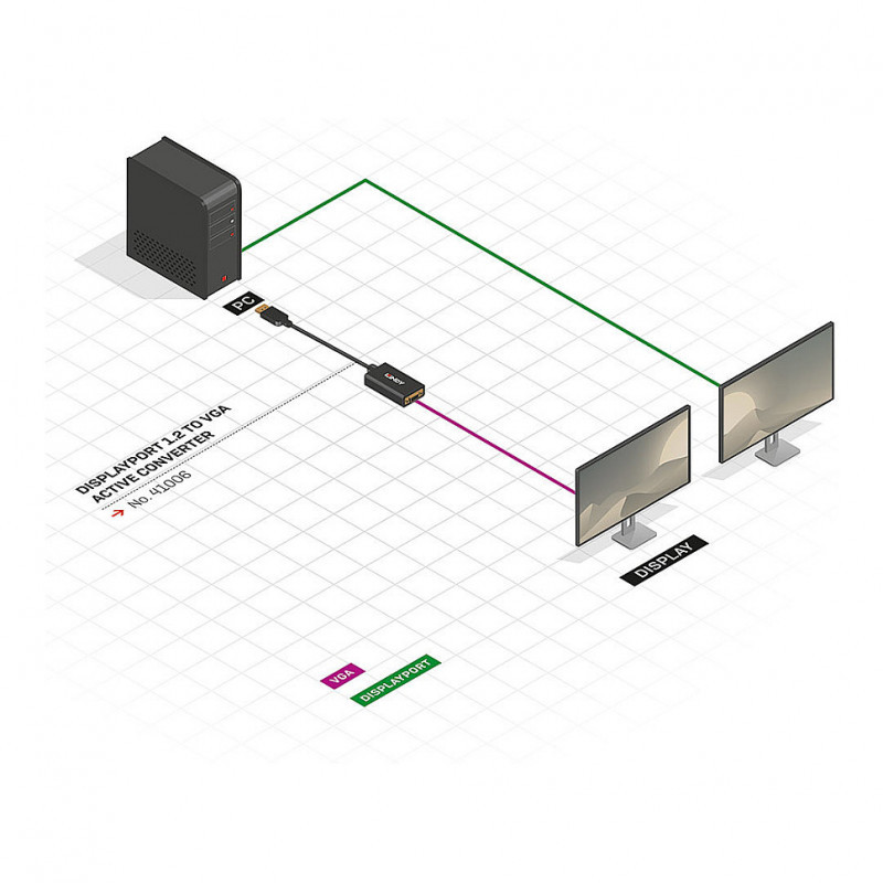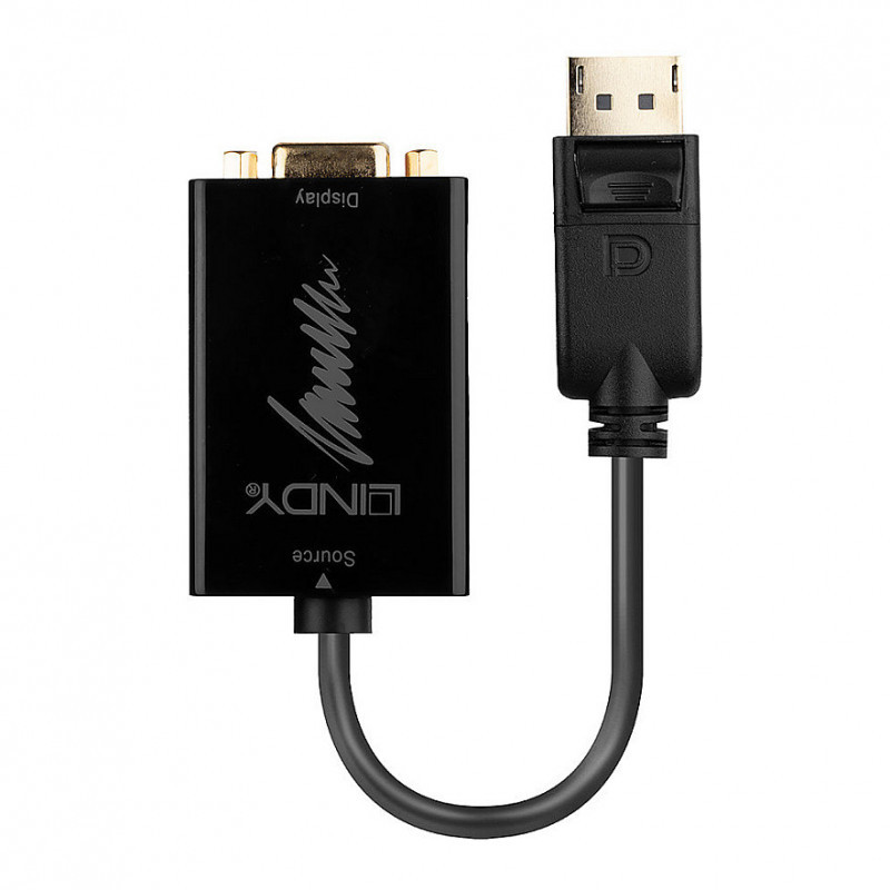 "Lindy DisplayPort 1.2 to VGA Active Converter. Cable length: 0.15 m, Connector 1: VGA (D-Sub), Connector 2: DisplayPort. Certification: CE, UKCA, FCC, RoHS, REACH. Cable diameter: 6.5 mm, Connector 1 dimensions (WxDxH): 38 x 61 x 17 mm, Connector 2 dimensions (WxDxH): 20 x 36 x 11 mm. Package width: 160 mm, Package depth: 20 mm, Package height: 160 mm. Quantity per pack: 1 pc(s)"\n"The Lindy DisplayPort 1.2 to VGA Converter is ideal for connecting a DisplayPort equipped source such as a PC or laptop to a VGA monitor. It supports high definition video resolutions up to 1920x1080@60Hz. Active conversion ensures compatibility with various graphics cards including AMD Eyefinity, NVIDIA surround and Intel Collage.