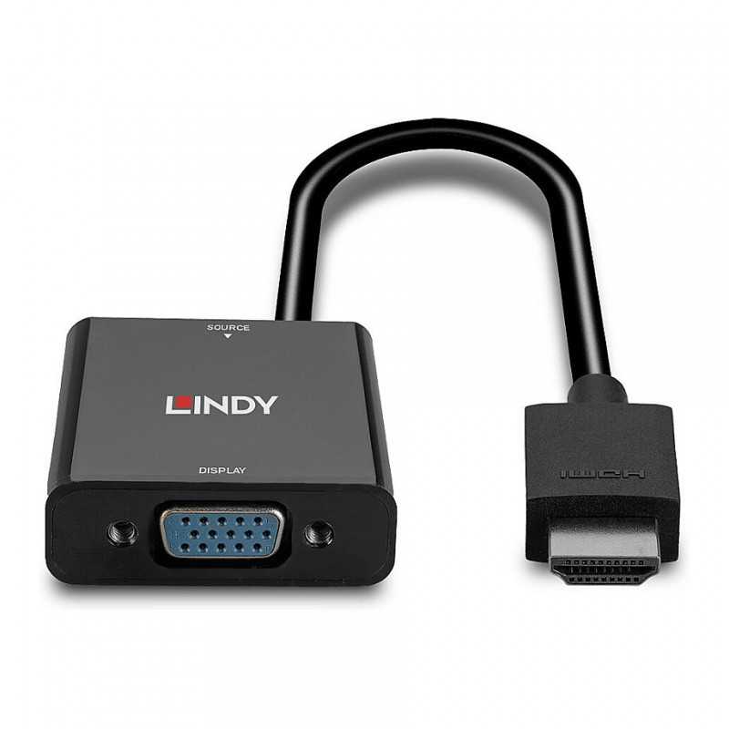 "Lindy HDMI to VGA Converter. Cable length: 0.1 m, Connector 1: HDMI Type A (Standard), Connector 2: VGA (D-Sub). Certification: CE, UKCA, FCC, RoHS, REACH. Cable diameter: 4.8 mm, Connector 1 dimensions (WxDxH): 37 x 42 x 14.5 mm, Connector 2 dimensions (WxDxH): 21 x 17.4 x 9.6 mm. Package width: 160 mm, Package depth: 20 mm, Package height: 160 mm. Quantity per pack: 1 pc(s)"\n"The Lindy HDMI 1.3 to VGA converter converts signals from an HDMI equipped source into an analogue VGA signal. It supports resolutions up to 1080p and 1920x1200 for PC VGA displays. This allows the connection of modern HDMI capable devices, such as PC's, notebooks and ultrabooks, to an older VGA display or projector.