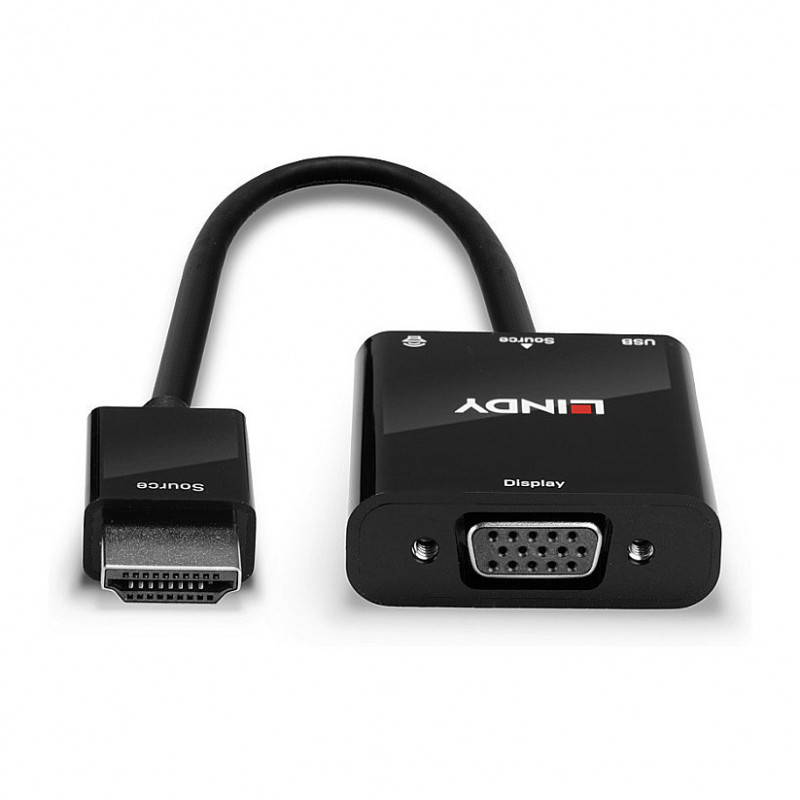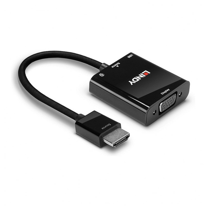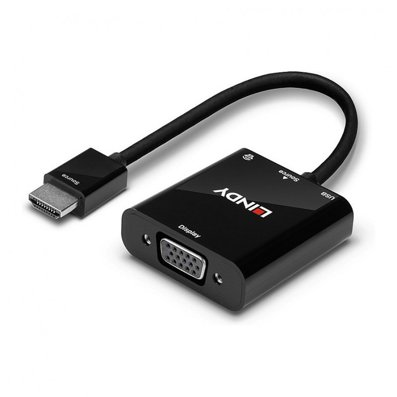 "Lindy HDMI to VGA and Audio Converter. Cable length: 0.1 m, Connector 1: HDMI Type A (Standard), Connector 2: VGA (D-Sub). Cable diameter: 4.8 mm. Package type: Polybag"\n"The Lindy HDMI 1.3 to VGA and Audio Converter is ideal for connecting HDMI equipped sources such as laptops, ultrabooks and PCs to VGA displays. It converts the HDMI signal (along with the associated digital audio stream) into an analogue VGA signal.