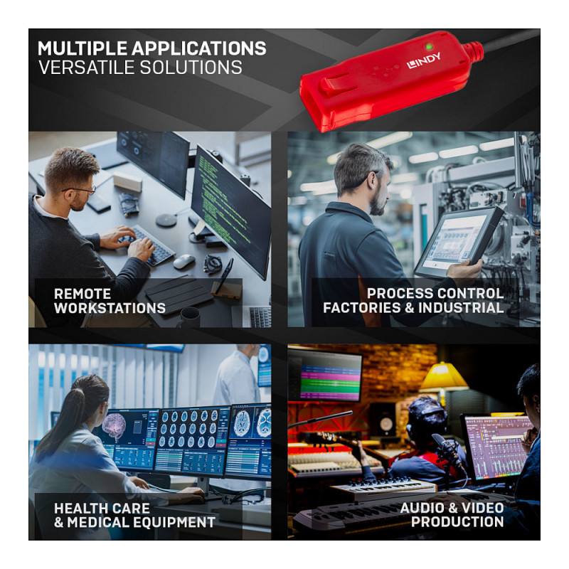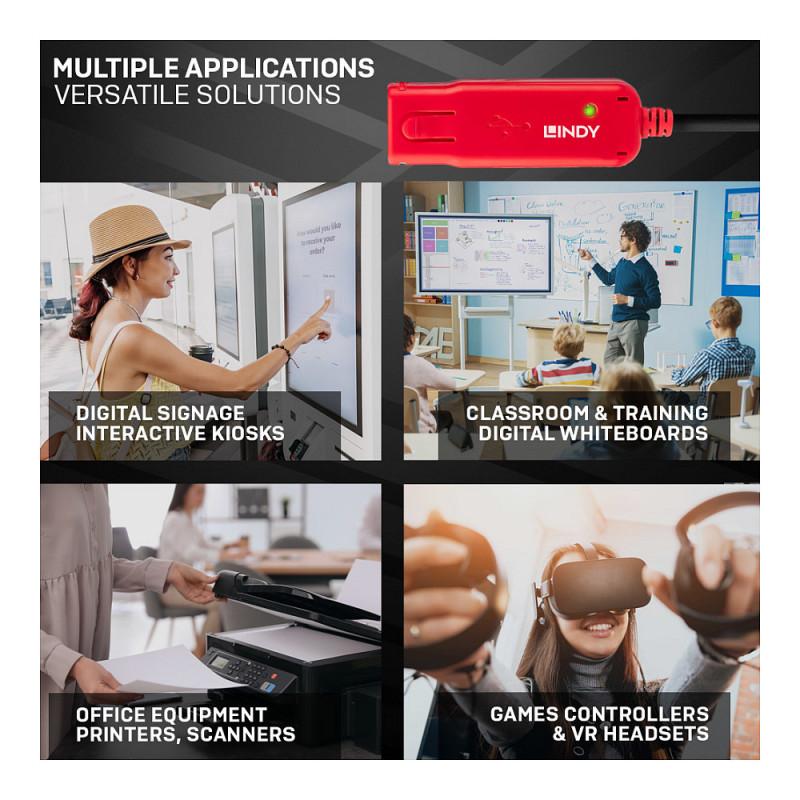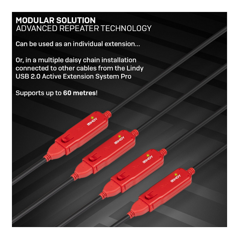 This 12m extension cable can be used standalone or as part of the Lindy USB 2.0 Active Extension System Pro. This system is a modular solution that can combine multiple USB Active Extension Pro cables and a USB 2.0 Active Extension Pro hub to distribute USB signals to up to 4 devices at up to 60m.