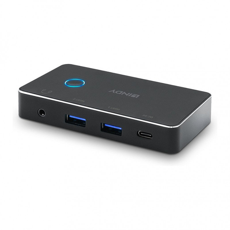 "Lindy 43387. Maximum data transfer rate: 5 Gbit/s, Power connector: USB Type-C, Product colour: Black. Operating voltage: 5 V. Width: 100 mm, Depth: 50 mm, Height: 16.4 mm. Cables included: USB. Package depth: 154 mm, Package width: 112 mm, Package height: 40 mm"\n"The Lindy USB 3.0 Sharing Switch 2:4 allows up to 2 users to share up to 4 USB 3.0 peripheral devices without the need to repeatedly swap cables or set up complicated network sharing software. The active computer port can be selected by push button. The switch is ideal for sharing a printer, storage device or webcam in office environments. It also allows to share a conference room presentation system like Barco Clickshare between two users. The USB 3.0 Sharing Switch features a 3.5mm Audio output port for connecting speakers or headphones.