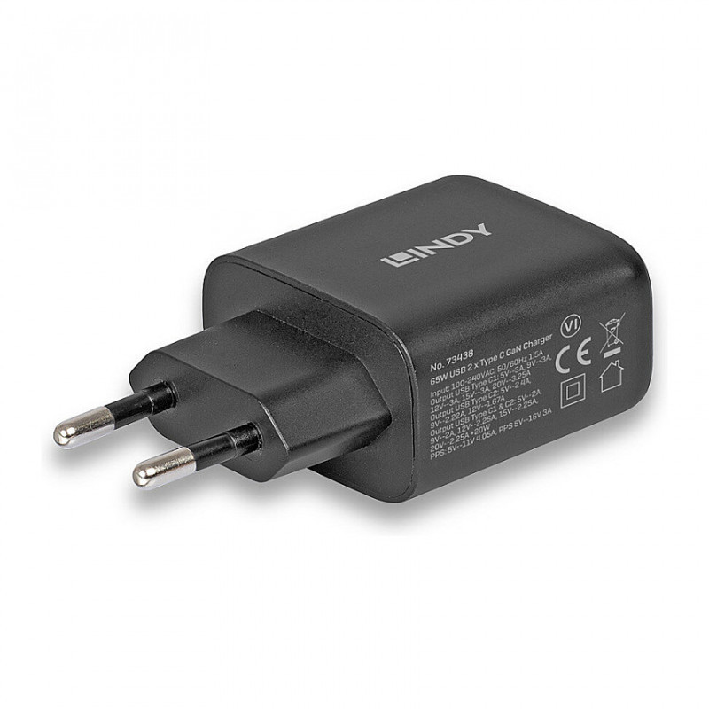 "Lindy 65W USB 2 x Type C GaN Charger. Charger type: Indoor, Power source type: AC, Charger compatibility: Universal. Input voltage: 100 - 240 V, Maximum output voltage: 20 V. USB Type-C ports quantity: 2, Fast charging, Power protection features: Over current, Over voltage, Overheating, Short circuit. Product colour: Black"\n"The Lindy 65W 2 x USB Type-C GaN Charger, a powerful and compact charging solution designed to meet the demands of modern devices. Utilizing advanced Gallium Nitride (GaN) technology, this charger delivers efficient, high-speed charging in a much smaller and lighter form factor compared to traditional chargers.