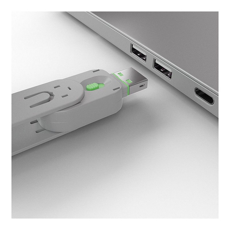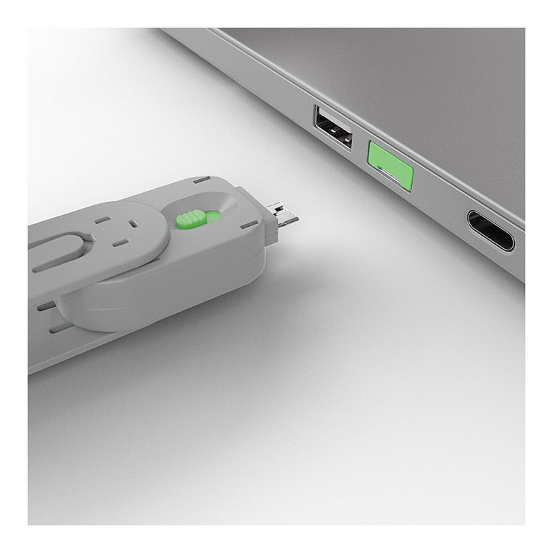 To use, simply attach a lock to the key and insert it into the USB port. Release the sliding mechanism on the key to leave the lock in place. To remove, simply insert the key back into the lock and pull away.