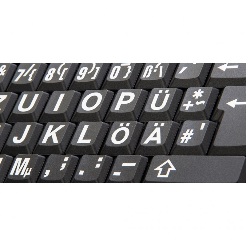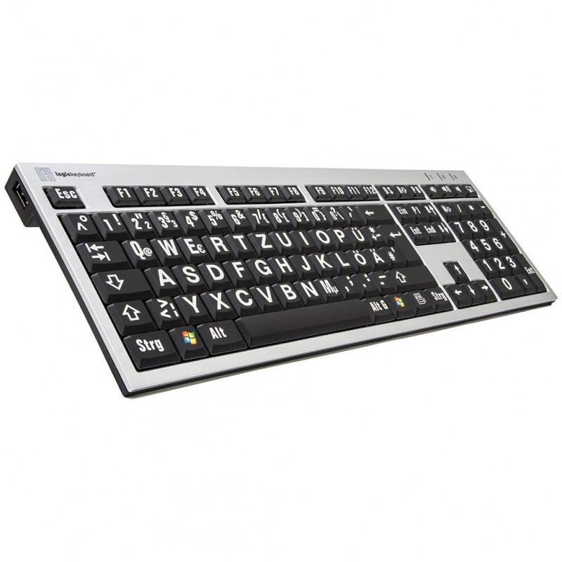 "Logickeyboard XLPrint. Keyboard form factor: Full-size (100%). Keyboard style: Straight. Connectivity technology: Wired, Device interface: USB, Keyboard layout: QWERTZ. Cable length: 1.5 m. USB hub, Recommended usage: Office. Product colour: Aluminium, Black"\n"Logickeyboard Large Print has been designed for individuals who suffer from visual impairments, or just have a hard time reading the existing commands on their keyboards. The custom Large Print makes controlling your keyboard a lot simpler and faster."