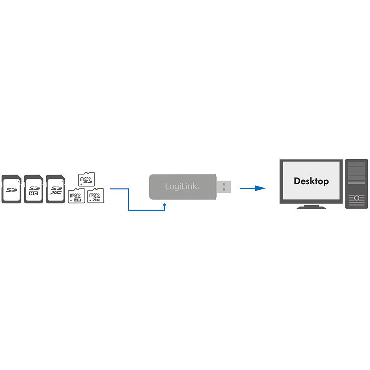 "LogiLink CR0034A. Compatible memory cards: MicroSD (TransFlash), MicroSDHC, MicroSDXC, SD, SDHC, SDXC, Product colour: White, Data transfer rate: 5000 Mbit/s. Interface: USB 3.2 Gen 1 (3.1 Gen 1). Width: 75 mm, Depth: 120 mm, Height: 25 mm"\n"Compact USB 3.0 card reader for reading and writing SD/SDHC, microSD/SDHC, as well SDXC cards and MicroSDXC. It is connected to the USB 3.0 port and is backwards compatible with USB 2.0 and USB 1.1."