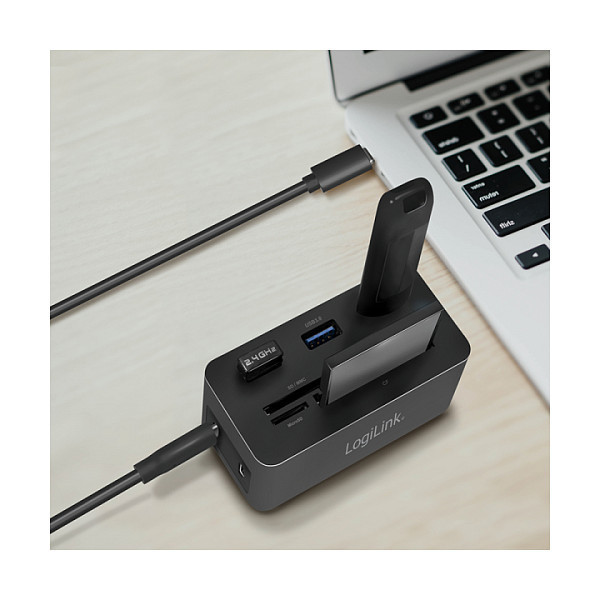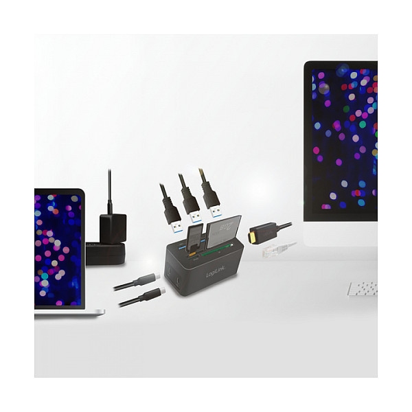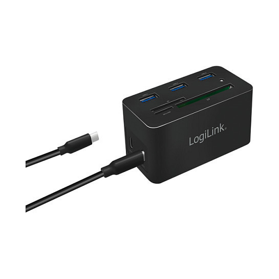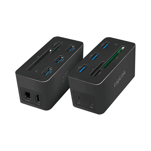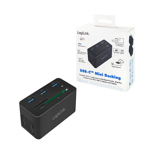 "LogiLink UA0370. Connectivity technology: Wired, Host interface: USB 3.2 Gen 1 (3.1 Gen 1) Type-C, USB Power Delivery up to: 60 W. Ethernet LAN data rates: 10,100,1000 Mbit/s. Product colour: Black, Compatible memory cards: CF, MicroSD (TransFlash), SD, Data transfer rate: 5 Gbit/s. Width: 46 mm, Depth: 41 mm, Height: 86 mm. Package width: 112 mm, Package depth: 50 mm, Package height: 110 mm"\n"Product information ""USB 3.2 (Gen 1) Docking Station, 10-Port, w/PD, mini, black"" from LogiLink