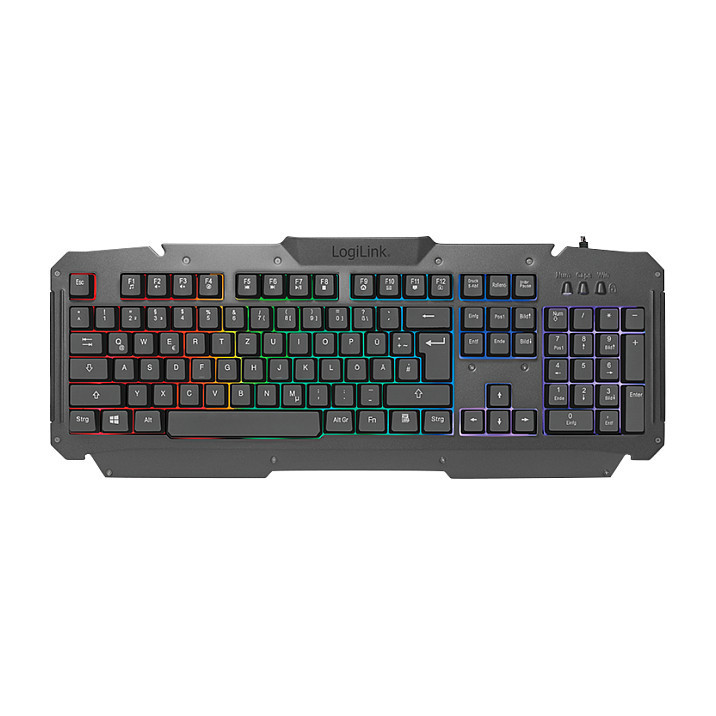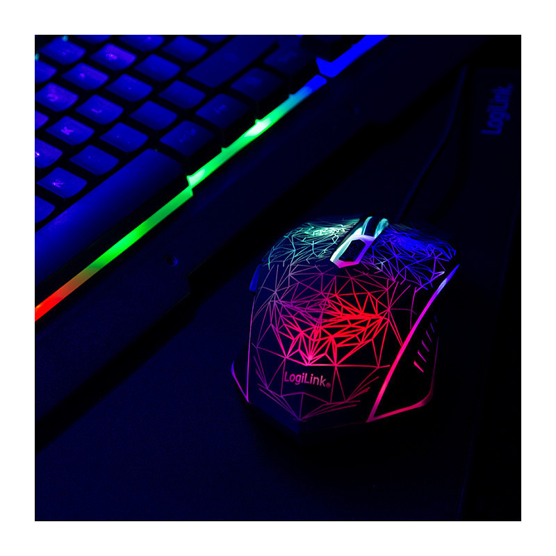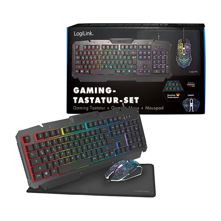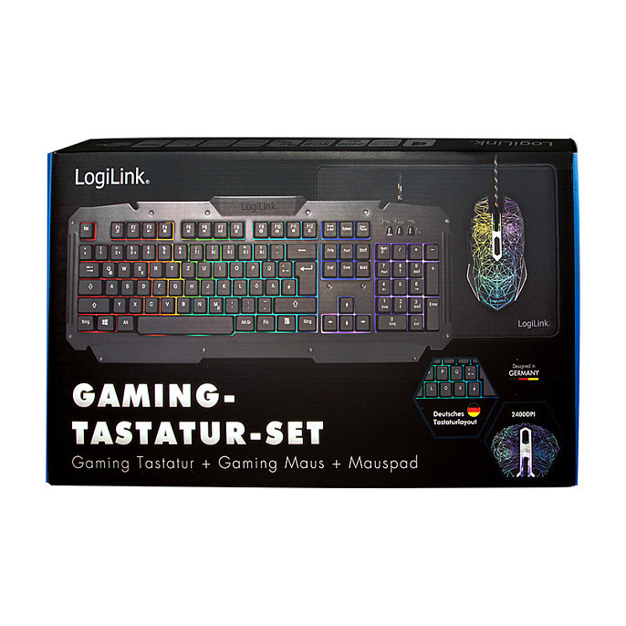 "LogiLink ID0185. Keyboard form factor: Full-size (100%). Keyboard style: Straight. Connectivity technology: Wired, Device interface: USB, Keyboard key switch: Membrane, Keyboard layout: QWERTY, Keyboard number of keys: 105. Backlight type: RGB LED. Cable length: 1.5 m. Recommended usage: Gaming. Product colour: Black. Mouse included"\n"Product information ""Gaming-Set, keyboard, mouse and mouspad"" from LogiLink
