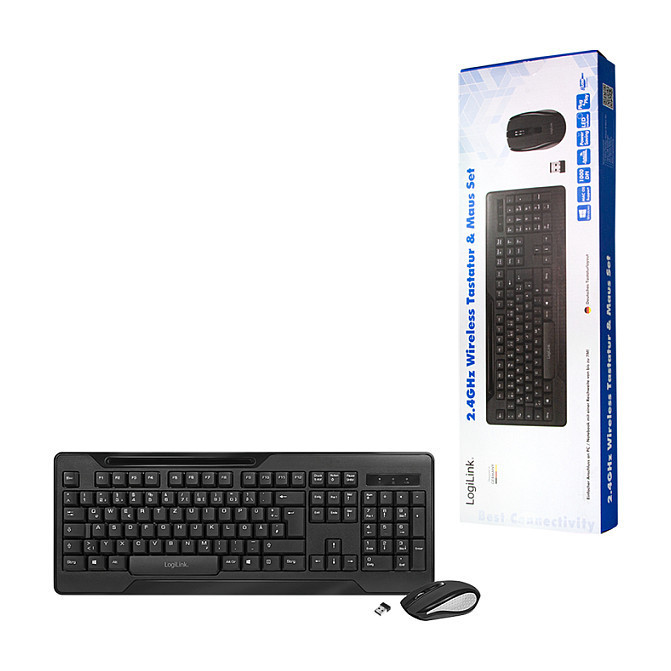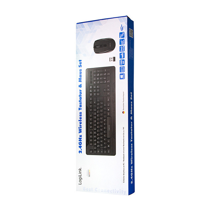"LogiLink ID0194. Keyboard form factor: Full-size (100%). Keyboard style: Straight. Connectivity technology: Wireless, Device interface: RF Wireless. Product colour: Black. Mouse included"\n"This combination of a 2.4 GHz Wireless keyboard and mouse from LogiLink enables you to work faster and more comfortable. The mouse with optical sensor ensures with its 1000 dpi scanning high precision. Connection via included USB micro dongle, which recognizes the devices automatically via Autolink function. The keyboard also has drainage holes in the bottom to prevent water from getting into the electrical components; the keys can be easily removed for thorough cleaning and maintenance."