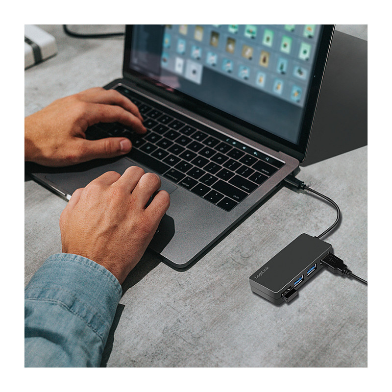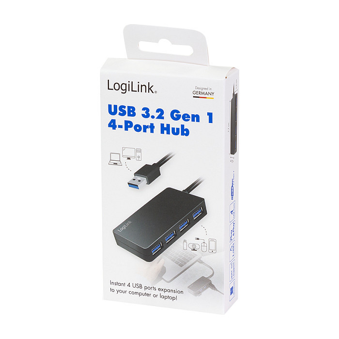 "LogiLink USB 3.2 Gen1, 4-port hub, black. Host interface: USB 3.2 Gen 1 (3.1 Gen 1) Type-A, Hub interfaces: USB 3.2 Gen 1 (3.1 Gen 1) Type-A. Data transfer rate: 5000 Mbit/s, Product colour: Black, Housing material: Acrylonitrile butadiene styrene (ABS). Power supply type: USB, Power supply: 4.5 W, Input voltage: 5 V. Windows operating systems supported: Windows 10, Windows 11, Windows 7, Windows 8, Windows 8.1, Mac operating systems supported: MacOS, Other operating systems supported: Android, ChromeOS. Width: 257 mm, Depth: 42 mm, Height: 12 mm"\n"The hub supports the modern USB 3.2 Gen1 standard and allows you to connect up to 4 USB devices (4x USB 3.2 Gen1 ports). Of course, you can also connect and use devices of older USB generations. Easy connection via plug & play. USB 3.2 transfer rates of up to 5 Gbit/s."