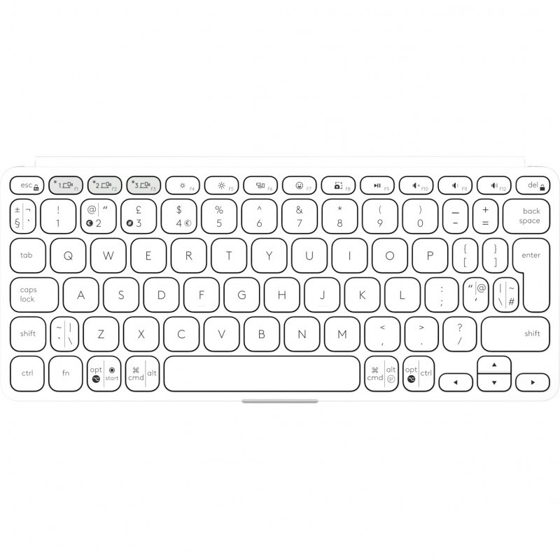 "Logitech Keys-To-Go 2. Keyboard layout: QWERTY, Keyboard language: US International, Keyboard key switch: Scissor key switch. Product colour: White. Connectivity technology: Wireless, Device interface: Bluetooth, Wireless range: 10 m. Battery capacity: 220 mAh. Other operating systems supported: ChromeOS, Mobile operating systems supported: Android 12.0, iOS, iPadOS, Windows operating systems supported: Windows 10, Windows 11"\n