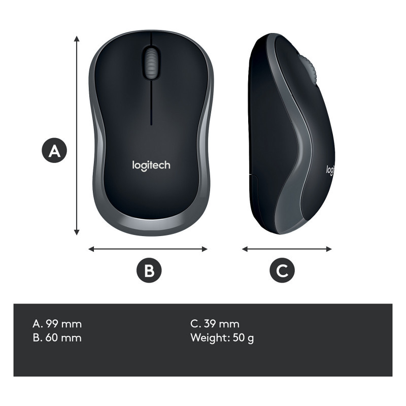"Logitech Wireless Mouse M185. Form factor: Ambidextrous. Movement detection technology: Optical, Device interface: RF Wireless, Movement resolution: 1000 DPI, Buttons type: Pressed buttons, Buttons quantity: 2, Scroll type: Wheel. Power source: Batteries. Product colour: Grey"\n