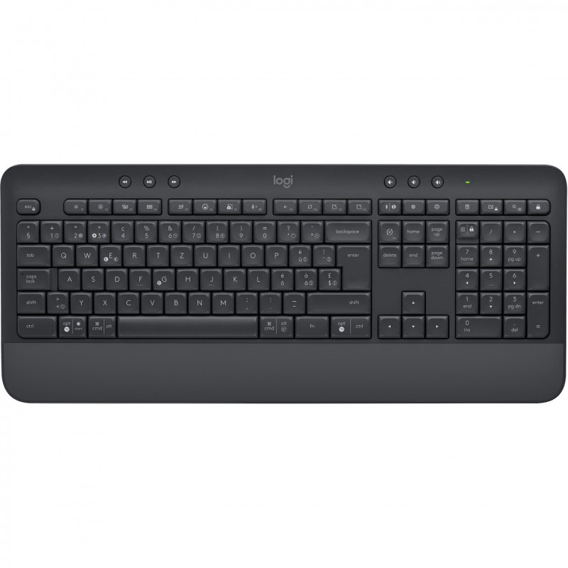 "Logitech SIGNATURE K650. Type in comfort. Get more done. Keyboard form factor: Full-size (100%). Keyboard style: Straight. Connectivity technology: Wireless, Device interface: Bluetooth, Keyboard key switch: Membrane, Keyboard layout: QWERTZ. Wrist rest. Recommended usage: Office. Product colour: Graphite"\n"TYPE IN COMFORT GET MORE DONE