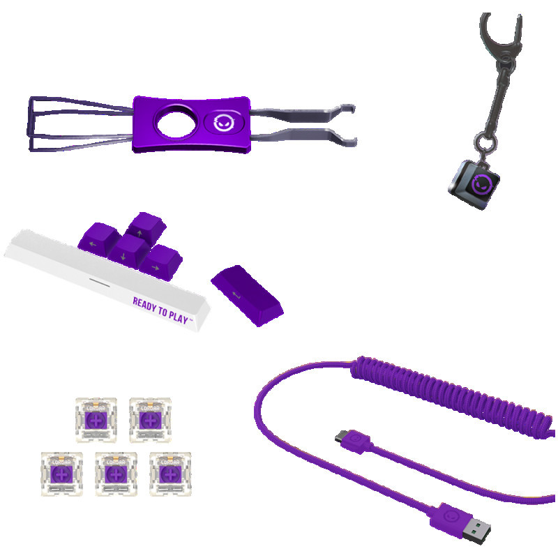 Trumpas pradžios vadovas Brush Keychain Cup coaster Two hand warmers Carrying Bag Six replacement keycaps Five spare switches Switch/Keycap puller |