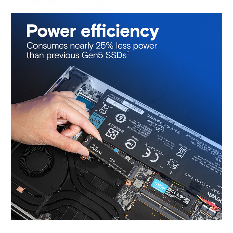 "Crucial P510. SSD capacity: 2 TB, SSD form factor: M.2, Read speed: 10000 MB/s, Write speed: 8700 MB/s, Component for: PC/Laptop"\n"Stay ahead of the curve with Gen5 storage