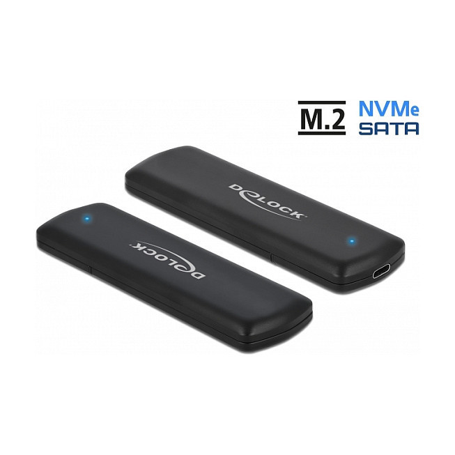 "DeLOCK External USB Type-C Combo Enclosure for M.2 NVMe PCIe or SATA SSD. Product type: SSD enclosure. Number of storage drives supported: 1, Storage drive size: M.2, Supported storage drive interfaces: PCI Express, Serial ATA. Data transfer rate: 10 Gbit/s. Product colour: Black. USB connector type: USB Type-C"\n"This enclosure by Delock enables the installation of an M.2 PCIe NVMe SSD or SATA M.2 SSD in 2280, 2260, 2242 and 2230 format. It can be connected via USB to the PC or laptop. The robust metal housing ensures an optimum temperature of the memory.