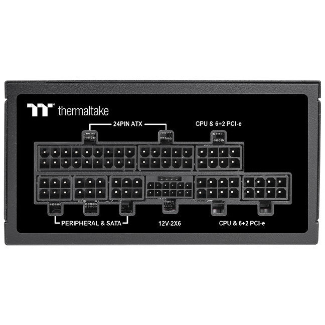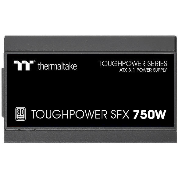 "Thermaltake Toughpower SFX Platinum 750W - TT Premium Edition. Total power: 750 W, AC input voltage: 100 - 240 V, AC input frequency: 50/60 Hz. Motherboard power connector: 24-pin ATX, Motherboard power cable length: 30 cm, SATA power cable length: 300,450,600,750 mm. Purpose: PC, Power supply unit (PSU) form factor: SFX, 80 PLUS certification: 80 PLUS Platinum. Product colour: Black, Cooling type: Active, Fan diameter: 9 cm. Safety: CE/UKCA/FCC/ICES/CB/TUV/cTUVus/LVD/CCC/BSMI/ S-MARK/EAC/RCM"\n"Toughpower SFX Platinum series is 80 PLUS Platinum certified and compatible with ATX 3.1 specifications. Designed with a native 12V-2x6 connector.