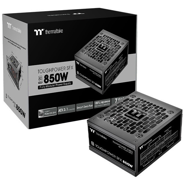 "Thermaltake Toughpower SFX Platinum 850W - TT Premium Edition. Total power: 850 W, AC input voltage: 100 - 240 V, AC input frequency: 50/60 Hz. Motherboard power connector: 24-pin ATX, Motherboard power cable length: 30 cm, SATA power cable length: 750,600,450,300 mm. Purpose: PC, Power supply unit (PSU) form factor: CFX, 80 PLUS certification: 80 PLUS Platinum. Product colour: Black, Cooling type: Active, Fan diameter: 9 cm. Safety: CE/UKCA/FCC/ICES/CB/TUV/cTUVus/LVD/CCC/BSMI/ S-MARK/EAC/RCM"\n"Toughpower SFX Platinum series is 80 PLUS Platinum certified and compatible with ATX 3.1 specifications. Designed with a native 12V-2x6 connector.