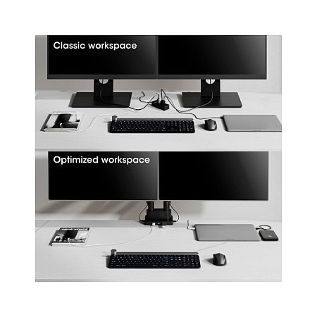 Turn your (home-) office dream desk into an ergonomic reality and reclaim valuable workspace with this combined monitor mount and docking station from Manhattan. Since it uses a gas spring to hold your displays, these monitor arms only need a light touch to move your screens to the best viewing angle for you. The dual-monitor VESA mount supports 17"" to 32"" displays with a weight capacity up to 9 kg (19.8 lbs.) each. An attractive black finish with powder coating complements your workspace.