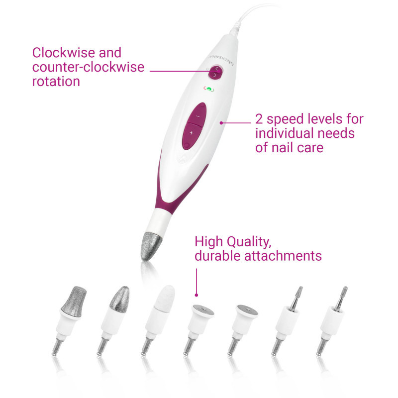 Medisana MP 815 manikiūro ir pedikiūro prietaisas – tai profesionalus įrankis, skirtas nagų, odelių ir nuospaudų priežiūrai. Prietaisas turi 7 aukštos kokybės antgalius, pritaikytus įvairiems rankų ir kojų priežiūros poreikiams, įskaitant safyro kūgį sausai odai šalinti ir veltinio kūgį nagų paviršiui lyginti. Įrenginys pasižymi dviem greičio lygiais (apie 3800 ir 4600 aps./min.) ir kairės/dešinės sukimosi funkcija, leidžiančia pritaikyti priežiūrą pagal individualius poreikius. Kompaktiškas dizainas (15 x 3,8 x 3,7 cm), svoris apie 942 g, maitinimas per tinklo adapterį ir patogi laikymo rankinė užtikrina paprastą naudojimą ir saugojimą. Tinka tiek namų, tiek profesionaliam naudojimui.