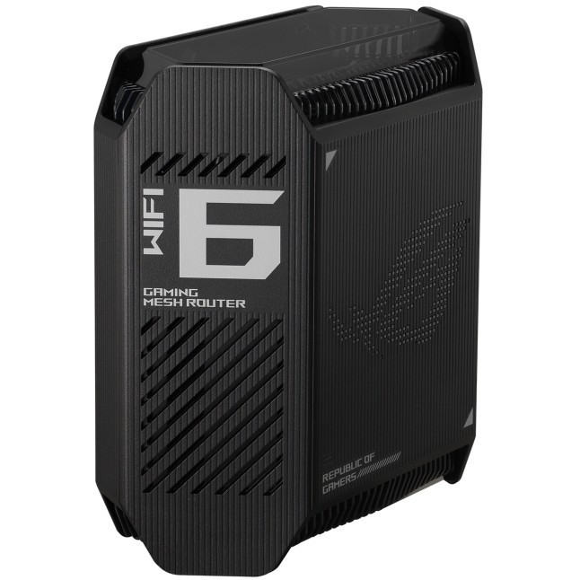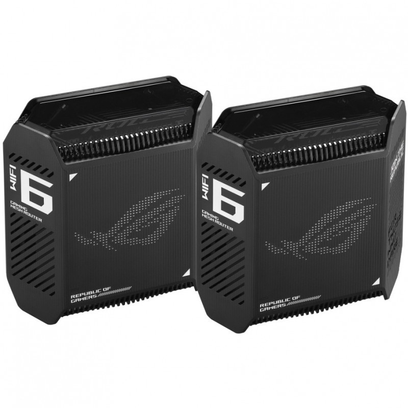 "ASUS ROG Rapture GT6 (B-2-PK). Product colour: Black, Antenna type: Internal, Product type: Mesh router. Wi-Fi band: Tri-band (2.4 GHz / 5 GHz / 5 GHz), Top Wi-Fi standard: Wi-Fi 6 (802.11ax), Wi-Fi standards: 802.11a, 802.11b, 802.11g, Wi-Fi 4 (802.11n), Wi-Fi 5 (802.11ac), Wi-Fi 6 (802.11ax). Processor frequency: 1.7 GHz, Internal memory: 512 MB, Flash memory: 256 MB. AC input voltage: 110 - 240 V, AC input frequency: 50 - 60 Hz, AC adapter output voltage: 19 V. Width: 172.3 mm, Depth: 78.1 mm, Height: 176.8 mm"\n"Game-Ready Mesh WiFi