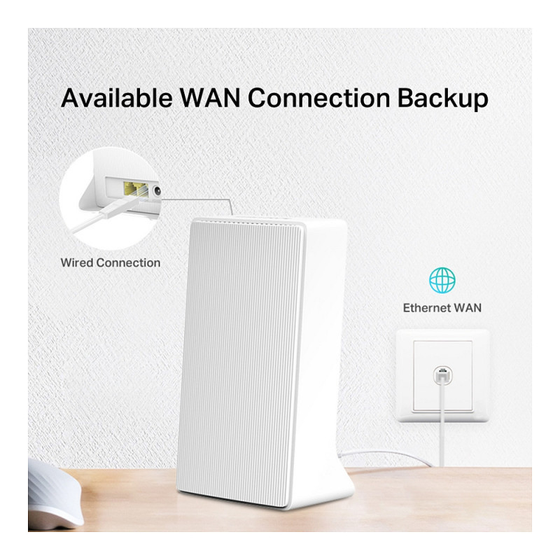 "Mercusys 4G+ Cat6 AC1200 Wireless Dual Band Gigabit Router. WAN connection type: RJ-45. Wi-Fi band: Dual-band (2.4 GHz / 5 GHz), Top Wi-Fi standard: Wi-Fi 5 (802.11ac), WLAN data transfer rate (max): 1200 Mbit/s. Ethernet LAN interface type: Gigabit Ethernet, Ethernet LAN data rates: 10,100,1000 Mbit/s, Cabling technology: 10/100/1000Base-T(X). Mobile network generation: 4G, 3G standards: HSPA, HSPA+, UMTS, 4G standard: LTE-TDD & LTE-FDD. Security algorithms: 64-bit WEP, WPA-PSK, WPA2-PSK, WPA3-SAE"\n"Faster and Smoother