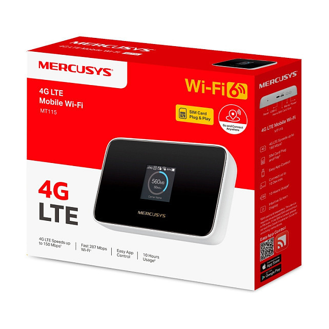 "Mercusys MT115. Device type: Cellular network router, Product colour: Black, White, Market positioning: Portable. Wi-Fi standards: 802.11b, 802.11g, Wi-Fi 4 (802.11n), Wi-Fi 5 (802.11ac), Wi-Fi 6 (802.11ax), Wi-Fi band: Single-band (2.4 GHz). Data network: 3G, 4G, 3G standards: HSPA+, UMTS, 4G standard: LTE-TDD & LTE-FDD. USB port type: USB Type-C. Security algorithms: WPA-PSK, WPA2-PSK"\n"Connect Everywhere with Superfast 4G LTE and WiFi 6