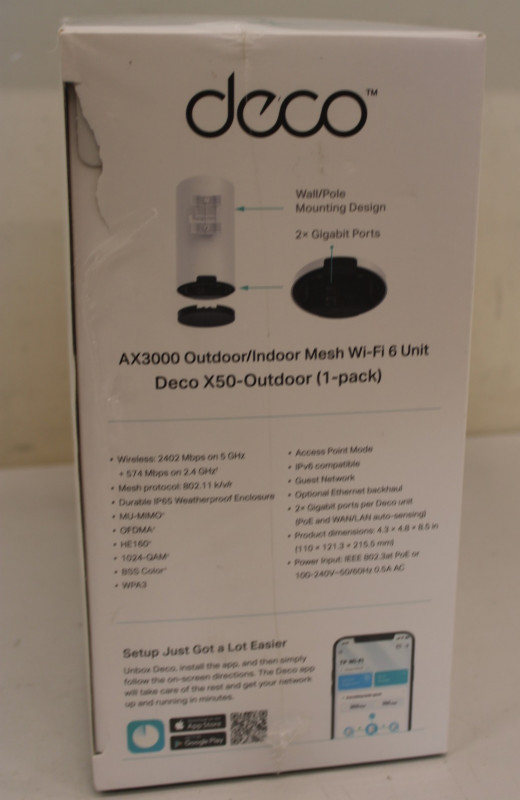SALE OUT. TP-LINK Deco X50-Outdoor AX3000 Outdoor Whole Home Mesh WiFi 6 Unit | SALE OUT. TP-LINK AX3000 Outdoor Whole Home Mesh WiFi 6 Unit | Deco X50-Outdoor | 802.11ax | 10/100/1000 Mbit/s | Ethernet LAN (RJ-45) ports 2 | Mesh Support Yes | MU-MiMO Yes | No mobile broadband | 24 month(s) | DAMAGED PACKAGING