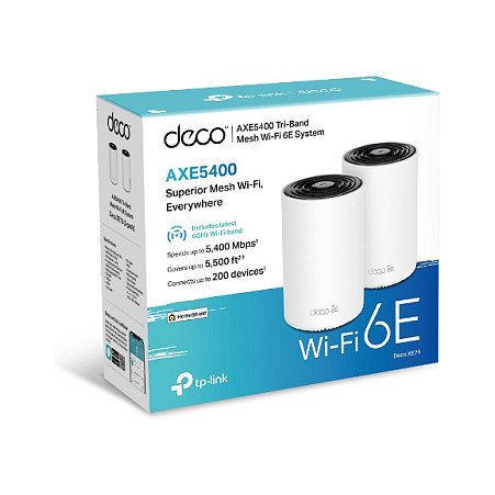 "TP-Link AXE5400 Tri-Band Mesh Wi-Fi 6E System, 2-Pack. Product colour: White, Antenna type: Internal, Maximum coverage: 510 m². Wi-Fi band: Tri-band (2.4 GHz / 5 GHz / 6 GHz), Top Wi-Fi standard: Wi-Fi 6E (802.11ax), Wi-Fi standards: 802.11a, 802.11b, 802.11g, Wi-Fi 4 (802.11n), Wi-Fi 5 (802.11ac), Wi-Fi 6 (802.11ax), Wi-Fi 6E.... Processor frequency: 1.7 GHz, Virtual assistant: Amazon Alexa, Cloud services supported: TP-Link ID. Compliance certificates: CE, RoHS. Width: 105 mm, Depth: 105 mm, Height: 169 mm"\n"New Band. New Possibilities.