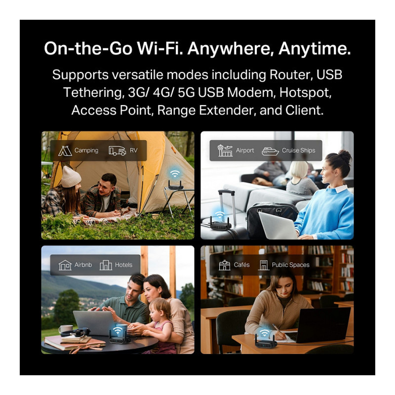With its versatile modes including Router, USB Tethering, 3G/ 4G/ 5G USB Modem, Hotspot, Access Point, Range Extender, and Client, TL-WR3602BE enables flexible WiFi setup for homes, hotel stays, and travel.