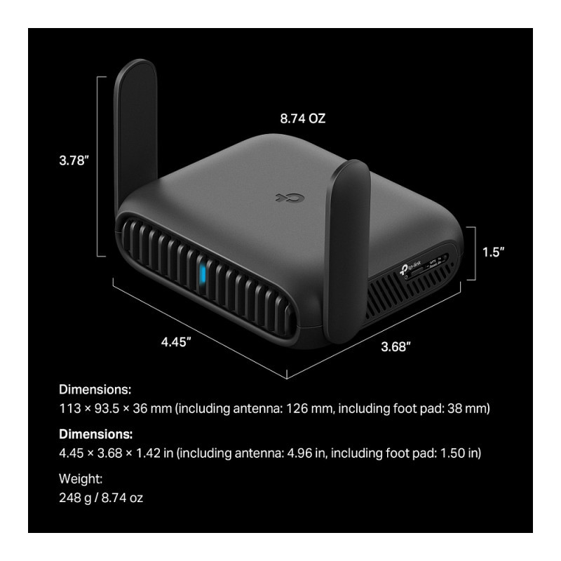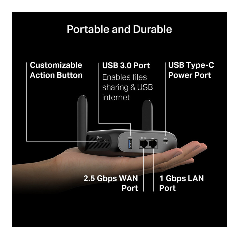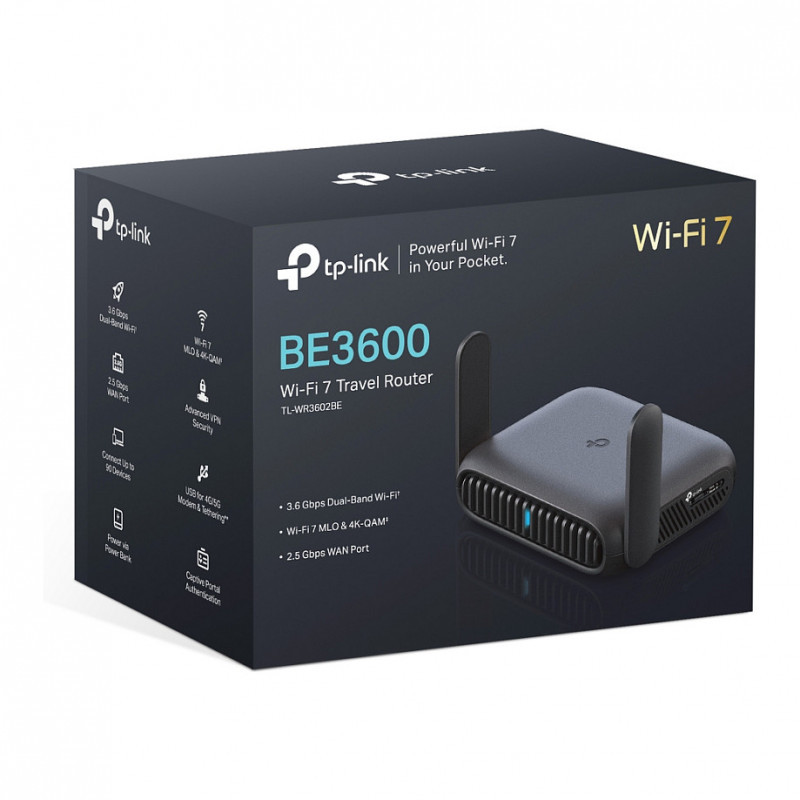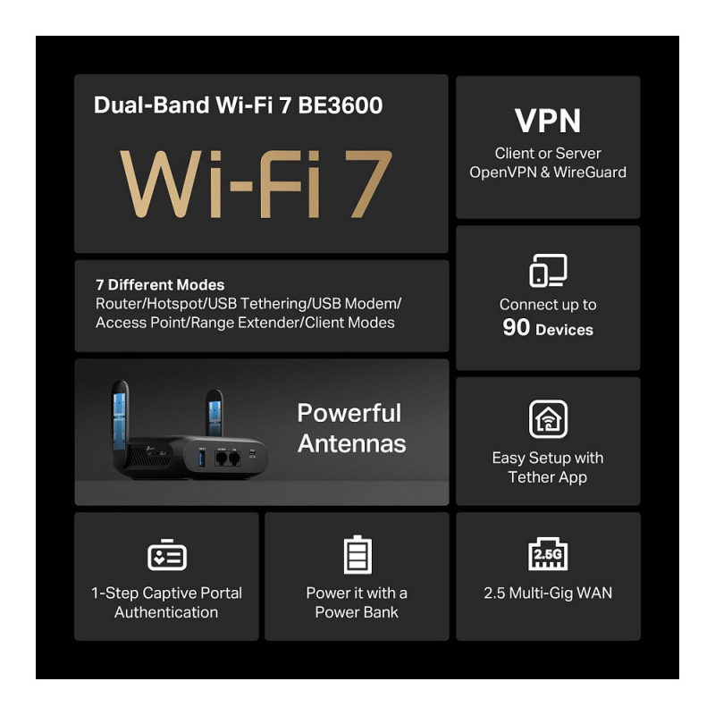 "TP-Link BE3600 Wi-Fi 7. WAN connection type: USB, WISP. Wi-Fi band: Dual-band (2.4 GHz / 5 GHz), Top Wi-Fi standard: Wi-Fi 7 (802.11be), WLAN data transfer rate (max): 2882 Mbit/s. Ethernet LAN interface type: 2.5 Gigabit Ethernet, Ethernet LAN data rates: 1000,2500 Mbit/s, VPN server: OpenVPN, PPTP, L2TP, Wireguard. Number of data streams: 4x4. Security algorithms: HTTPS, WPA, WPA2-Enterprise, WPA2-PSK, WPA3-Personal"\n"Powerful Wi-Fi 7 in Your Pocket.