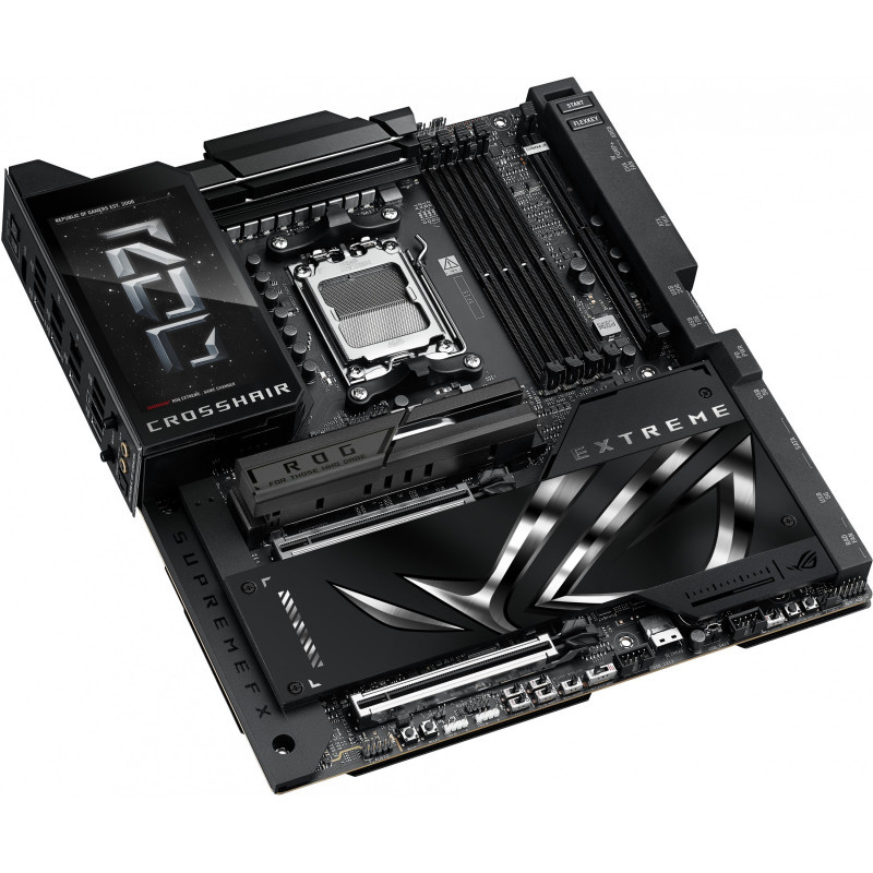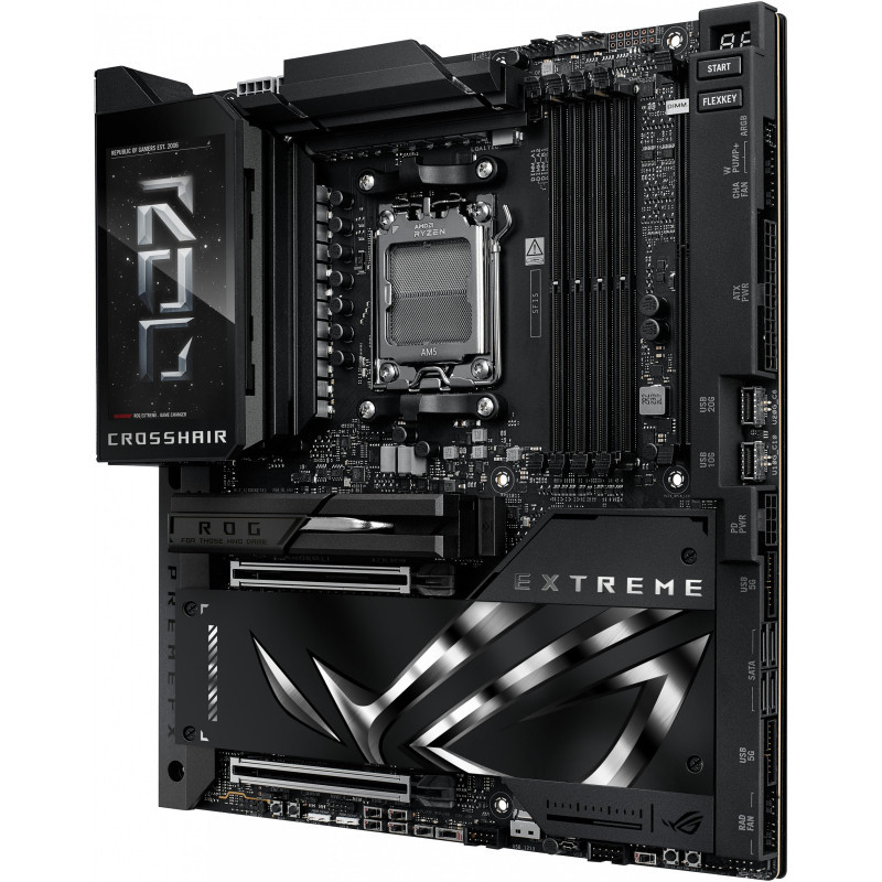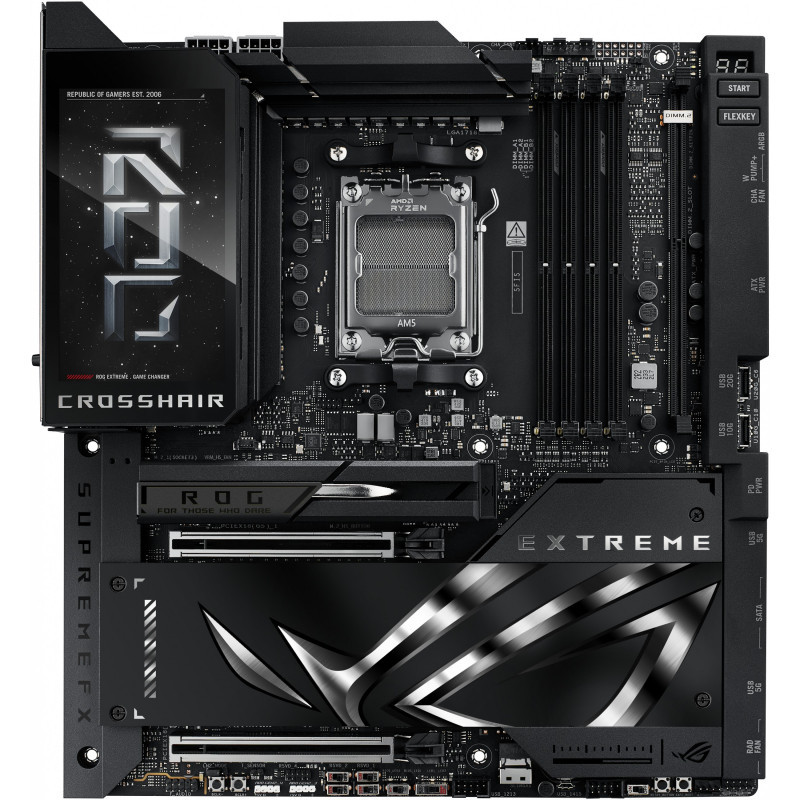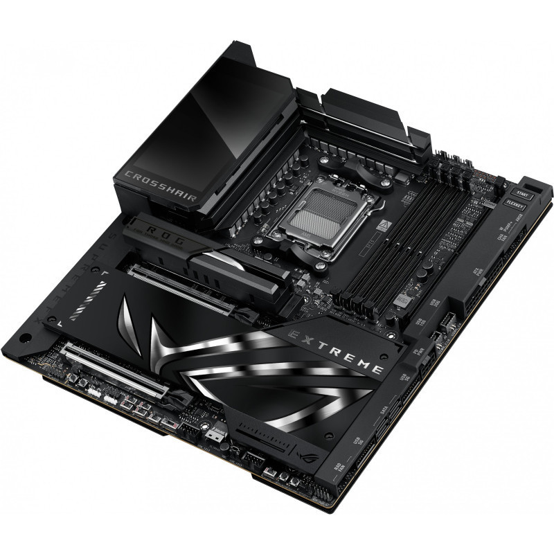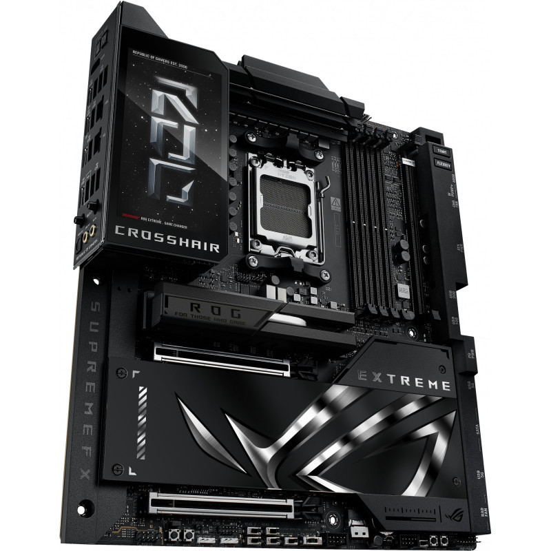 "ASUS ROG CROSSHAIR X870E EXTREME. Processor manufacturer: AMD, Processor socket: Socket AM5, Compatible processor series: AMD Ryzen 7000 Series, AMD Ryzen 8000 Series, AMD Ryzen 9000 Series. Supported memory types: DDR5-SDRAM, Maximum internal memory: 256 GB, Memory slots type: DIMM. Supported storage drive interfaces: M.2, SATA III, SlimSAS, Supported storage drive types: HDD & SSD, RAID levels: 0, 1, 5, 10. Ethernet interface type: 5 Gigabit Ethernet, 10 Gigabit Ethernet, Top Wi-Fi standard: Wi-Fi 7 (802.11be), Wi-Fi standards: Wi-Fi 7 (802.11be). Component for: PC, Motherboard form factor: Extended ATX, Motherboard chipset family: AMD"\n"ROG Crosshair X870E Extreme