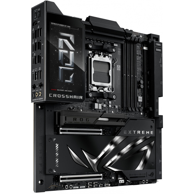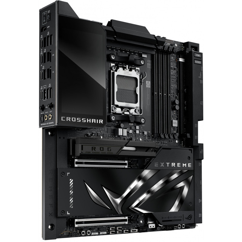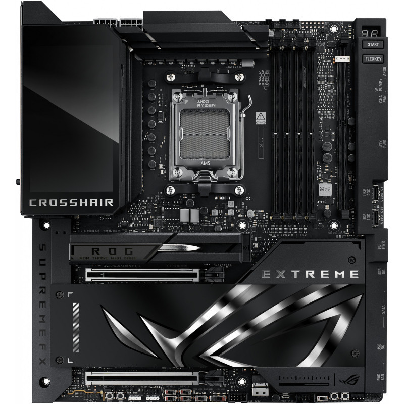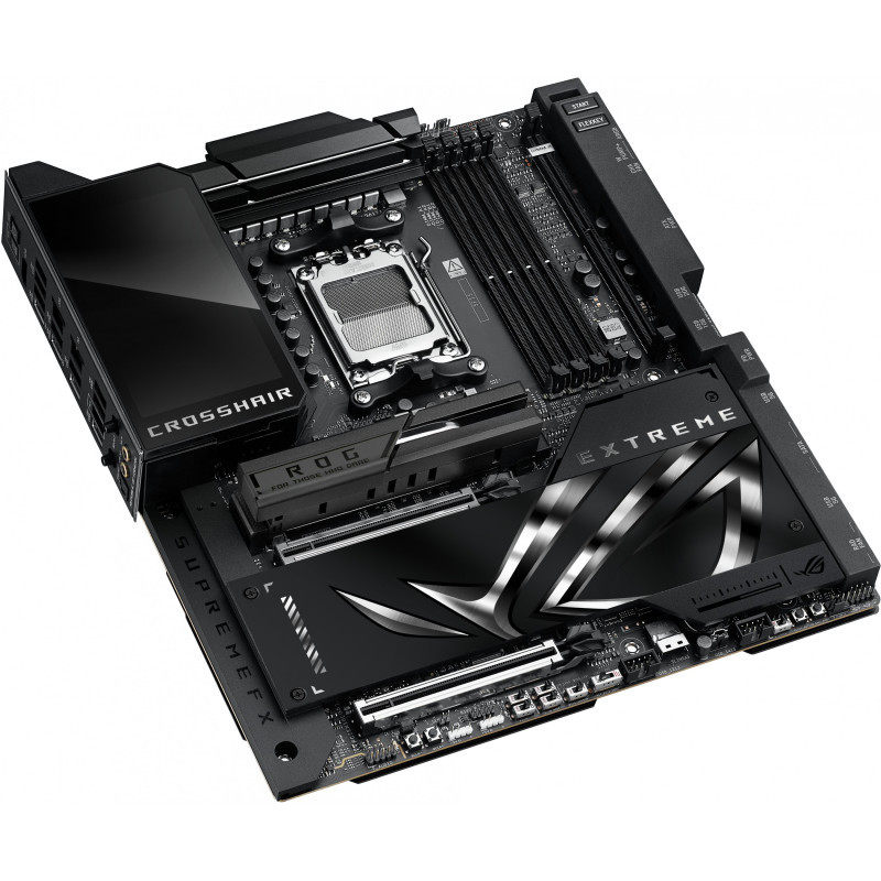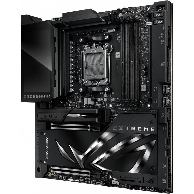 "ASUS ROG CROSSHAIR X870E EXTREME. Processor manufacturer: AMD, Processor socket: Socket AM5, Compatible processor series: AMD Ryzen 7000 Series, AMD Ryzen 8000 Series, AMD Ryzen 9000 Series. Supported memory types: DDR5-SDRAM, Maximum internal memory: 256 GB, Memory slots type: DIMM. Supported storage drive interfaces: M.2, SATA III, SlimSAS, Supported storage drive types: HDD & SSD, RAID levels: 0, 1, 5, 10. Ethernet interface type: 5 Gigabit Ethernet, 10 Gigabit Ethernet, Top Wi-Fi standard: Wi-Fi 7 (802.11be), Wi-Fi standards: Wi-Fi 7 (802.11be). Component for: PC, Motherboard form factor: Extended ATX, Motherboard chipset family: AMD"\n"ROG Crosshair X870E Extreme