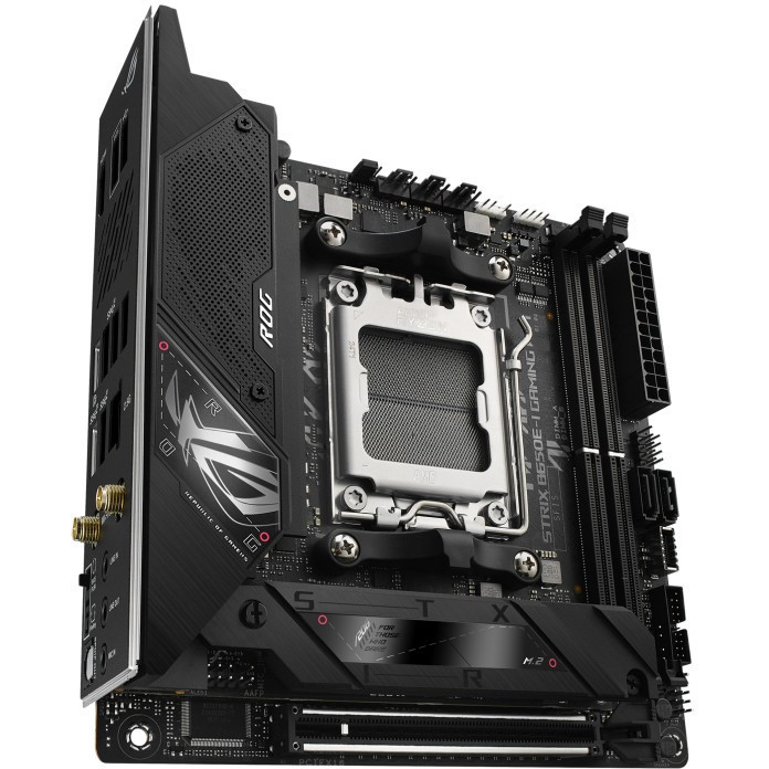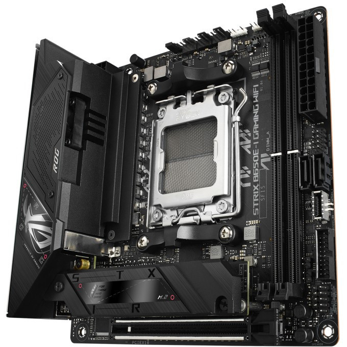 "ASUS ROG STRIX B650E-I GAMING WIFI. Processor manufacturer: AMD, Processor socket: Socket AM5, Compatible processor series: AMD Ryzen™ 7. Supported memory types: DDR5-SDRAM, Maximum internal memory: 64 GB, Memory slots type: DIMM. Supported storage drive interfaces: M.2, SATA III, Supported storage drive types: HDD & SSD, RAID levels: 0, 1. Ethernet interface type: 2.5 Gigabit Ethernet, Top Wi-Fi standard: Wi-Fi 6E (802.11ax), Wi-Fi standards: 802.11a, 802.11b, 802.11g, Wi-Fi 4 (802.11n), Wi-Fi 5 (802.11ac), Wi-Fi 6 (802.11ax), Wi-Fi 6E.... Component for: PC, Motherboard form factor: mini ITX, Motherboard chipset family: AMD"\n"ROG STRIX B650E-I GAMING WIFI