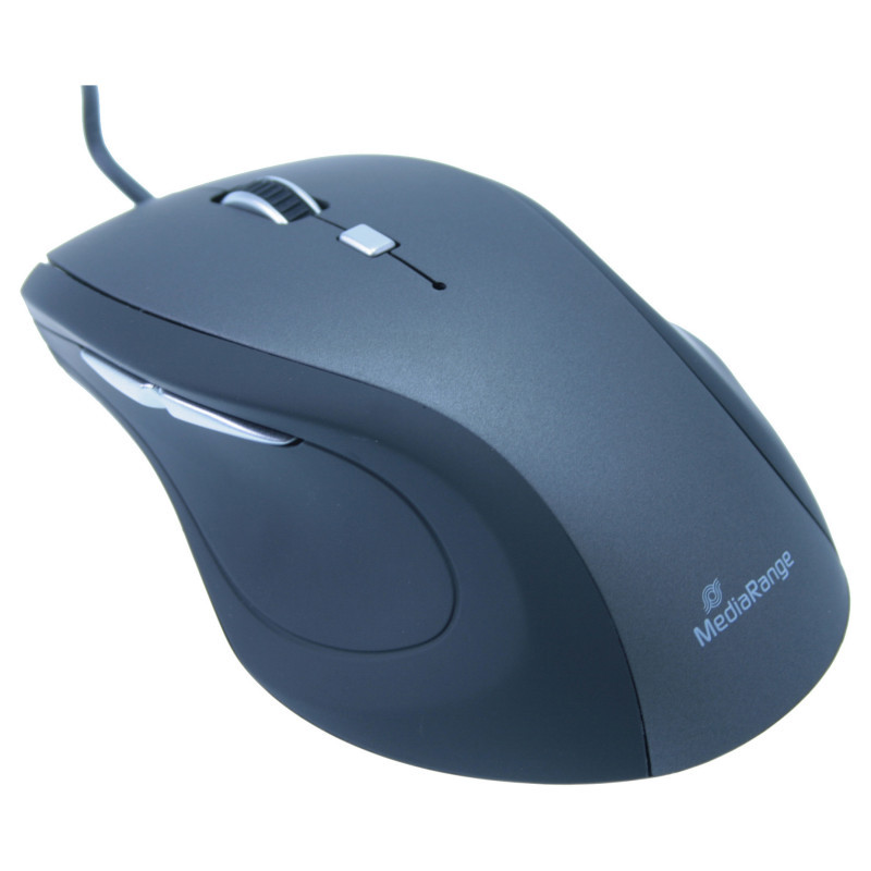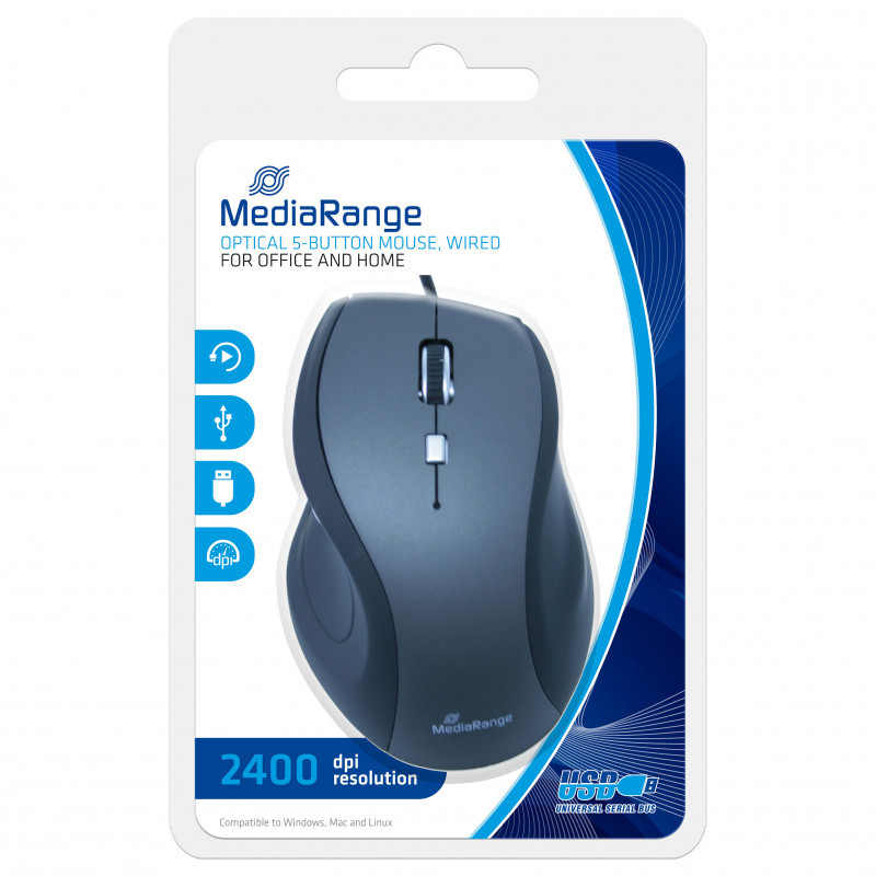 "MediaRange MROS202. Form factor: Right-hand. Movement detection technology: Optical, Device interface: USB Type-A, Movement resolution: 2400 DPI, Buttons type: Pressed buttons, Buttons quantity: 5, Scroll type: Wheel. Power source: Cable. Product colour: Black, Grey"\n"MediaRange input devices are perfect for all applications in the office or at home. Our optical 5-button mouse can be quickly and easily connected via the USB plug with any computer and is ready to use with all common operating systems."