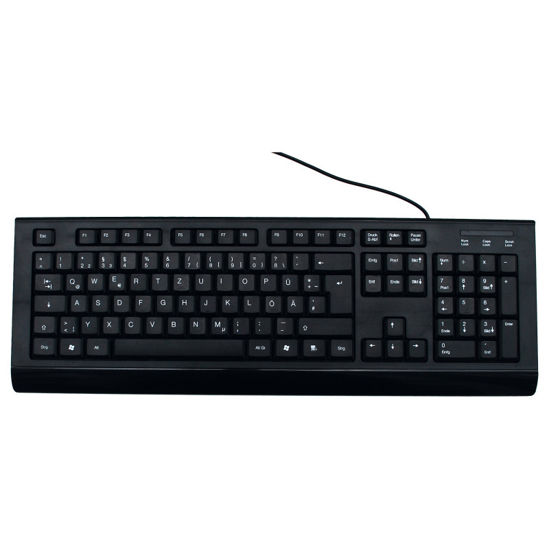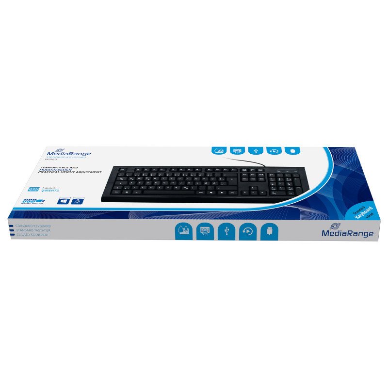 "MediaRange MROS101. Keyboard form factor: Full-size (100%). Keyboard style: Straight. Connectivity technology: Wired, Device interface: USB, Keyboard layout: QWERTZ, Keyboard number of keys: 107, Recommended usage: Office. Product colour: Black"\n"MediaRange input devices are perfect for all applications in the office or at home. Our keyboards can be quickly and easily connected via the USB plug with any computer and are ready to use with all common operating systems. With more than 10 million keystrokes and splash protection, our keyboards are perfectly protected against everyday wear and tear. The practical height adjustment allows you a better writing comfort."