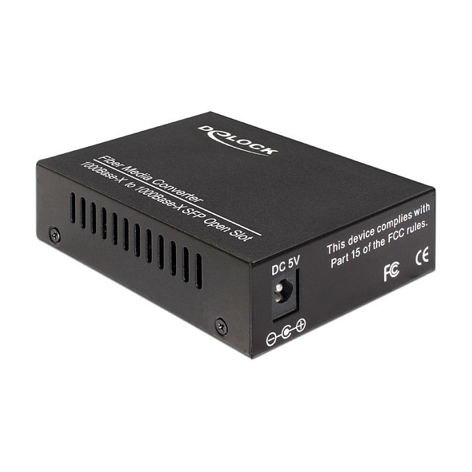 "DeLOCK 86203. Maximum data transfer rate: 1000 Mbit/s, Converter input interface: 1000Base-X, Converter output interface: 1000Base-X. Product colour: Black, Housing material: Metal. Fiber optic connector: SFP, Connectivity technology: Wired. Input voltage: 5 V, Power consumption (typical): 2.5 W. Width: 70 mm, Depth: 95 mm, Height: 26 mm"\n"This Gigabit Ethernet Media Converter by Delock can be used to connect different optical media. For example, multimode fiber can be converted to singlemode fiber. In the SFP slots, various optional 1 Gb/s SFP modules by Delock can be used."
