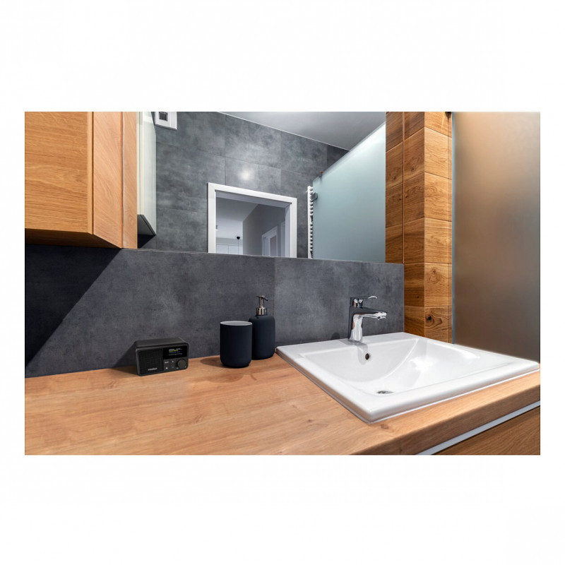 "MEDION LIFE S66822 Tragbares. Radio type: Portable, Tuner type: Digital, Supported radio bands: DAB+, UKW. RMS rated power: 2 W. Display type: TFT, Display diagonal: 3.73 cm (1.47""). Product colour: Black, International Protection (IP) code: IPX1. Battery life: 6.5 h"\n
