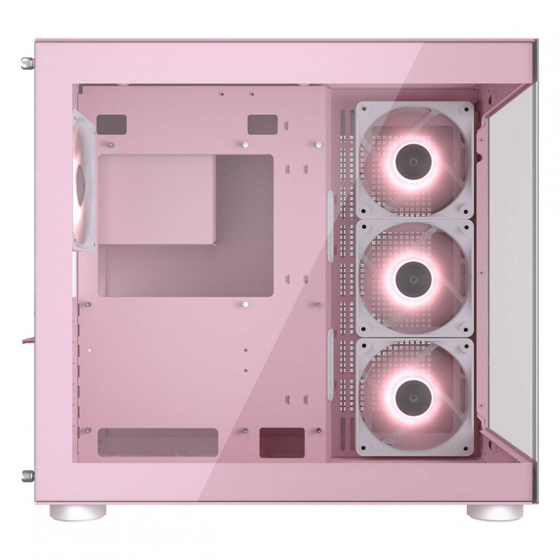 "COUGAR Midi Tower Case, FV150 ARGB, Pink. Form factor: Midi Tower, Type: PC, Product colour: Pink. Side fans installed: 3x 120 mm, Side fans diameters supported: 120,140 mm, Rear fans installed: 1x 120 mm. Supported HDD sizes: 2.5,3.5"". Width: 300 mm, Depth: 400 mm, Height: 415 mm. Package width: 421 mm, Package depth: 487 mm, Package height: 543 mm"\n"Build Visibility and Hardware Management, Perfectly Balanced