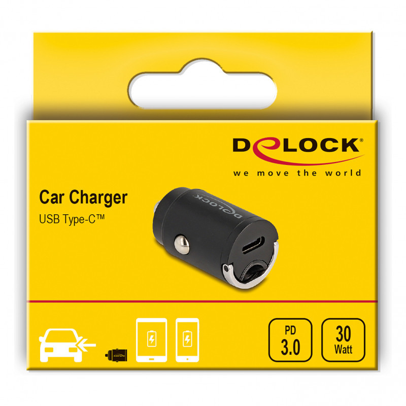"DeLOCK 64278. Charger type: Auto, Power source type: Cigar lighter, Charger compatibility: Universal. Input voltage: 12 - 24 V, Maximum output voltage: 20 V. USB Type-C ports quantity: 1, Fast charging, Power protection features: Over current, Overheating, Overload, Short circuit. Product colour: Black"\n"This USB car charger by Delock can be used to charge a USB device. The USB port is equipped with a USB Type-C™ Power Delivery (PD), thereby supported devices can be charged with up to 30 watt.