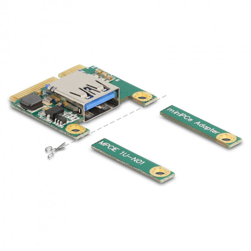 "DeLOCK Mini PCIe I/O 1 x USB 2.0 Type-A female full size / half size. Host interface: Mini PCI Express, Output interface: USB 2.0, Host interface gender: Male. Product colour: Green, Purpose: PC, Country of origin: China. Data transfer rate (max): 0.48 Gbit/s. Output voltage: 5 V, Output current: 0.5 A. Width: 30 mm"\n"This Mini PCIe module by Delock expands your system by one USB 2.0 port. You can connect different USB devices like e.g. USB WLAN stick, USB memory etc. The module can be cut from full size to half size at the marked position."