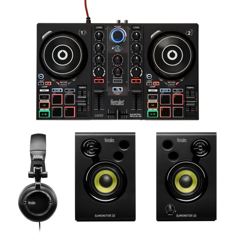 "Hercules DJLearning Kit. Headphone connectivity: 3.5 mm"\n"Hercules DJLearning Kit is the perfect all-in-one kit to get started as a DJ. It includes the DJControl Inpulse 200 controller, DJMonitor 32 monitoring speakers, and HDP DJ45 headphones. It’s the ultimate gift for anyone who wants to get started mixing, improve their skills and really become a DJ! Hercules DJLearning Kit comes with the full version of the DJUCED software for the