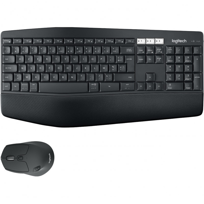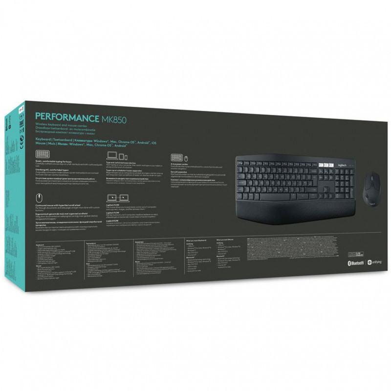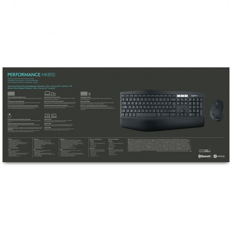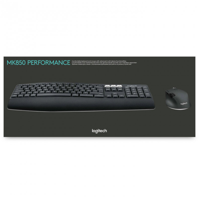 "Logitech MK850 Performance. Keyboard form factor: Full-size (100%). Keyboard style: Straight. Connectivity technology: Wireless, Device interface: RF Wireless + Bluetooth, Keyboard layout: AZERTY. Wrist rest. Recommended usage: Universal. Product colour: Black. Mouse included"\n"Experience next-level comfort and productivity with the powerful MK850 Performance. Fly through documents and web pages with hyper-fast scrolling – and type quietly and efficiently on a full-size keyboard with carefully-crafted keys. The cushioned palm rest and curved keyframe gives you the support you need, adjustable tilt legs offer the perfect typing angle, and the contoured design of the mouse fits comfortably in your palm. Type and switch seamlessly between your computer, tablet, and phone¹. Pair your mouse with up to 3 devices.