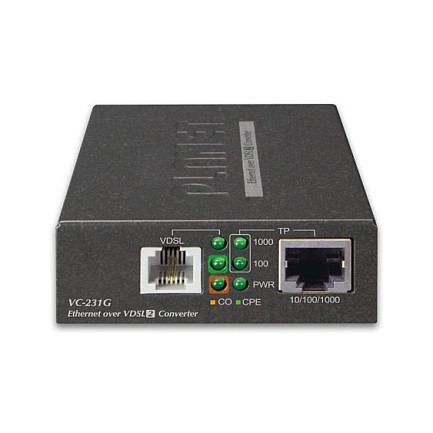 "PLANET VC-231G. Maximum data transfer rate: 1000 Mbit/s, Networking standards: IEEE 802.1p, IEEE 802.3, IEEE 802.3ab, IEEE 802.3u, IEEE 802.3x, Cabling technology: 10/100/1000Base-T(X). Product colour: Black. Connectivity technology: Wired. Weight: 184 g. Dimensions (WxDxH): 97 x 70 x 26 mm, Power requirements: DC 5V, 2A"\n"PLANET’s VC-231G, a high-performance Gigabit Ethernet-over-VDSL2 Converter, works well with a telephone line network with a symmetric data rate of up to 200/160Mbps (G.INP, Sym, 8dB) over a distance of 300m and 20/12Mbps over a long distance of 1.4km. It is based on the two-core networking technology, Gigabit Ethernet and VDSL2 (Very-high-data-rate Digital Subscriber Line 2). VDSL2 technology offers the fastest data transmission speed over the existing copper telephone lines without the need of rewiring.