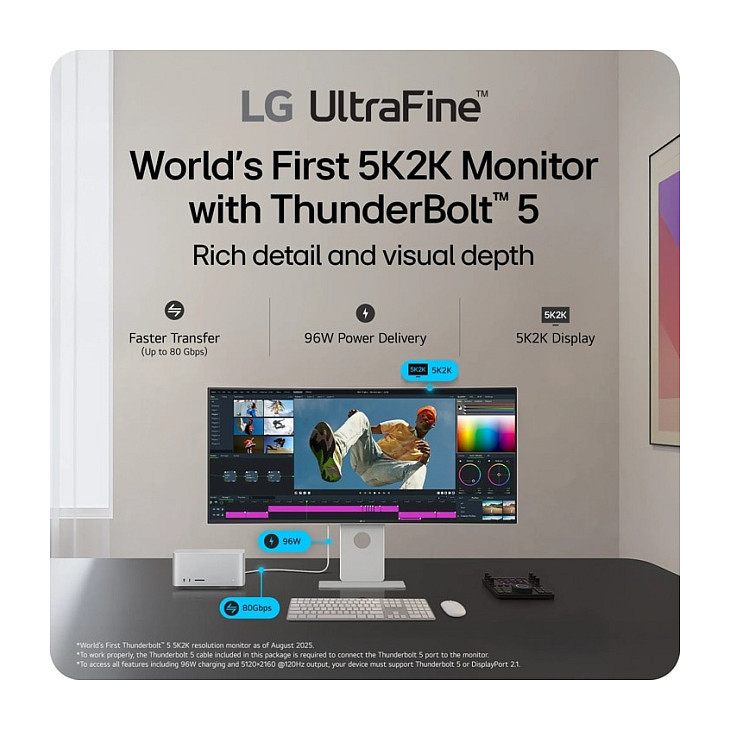 "LG 40U990A-W. Display diagonal: 101.6 cm (40""), Display resolution: 5120 x 2160 pixels, HD type: WUHD, Response time: 5 ms, Native aspect ratio: 21:9, Viewing angle, horizontal: 178°, Viewing angle, vertical: 178°. Built-in speaker(s). VESA mounting, Height adjustment. Product colour: Black"\n"The World’s First 5K2K Monitor with Thunderbolt™ 5