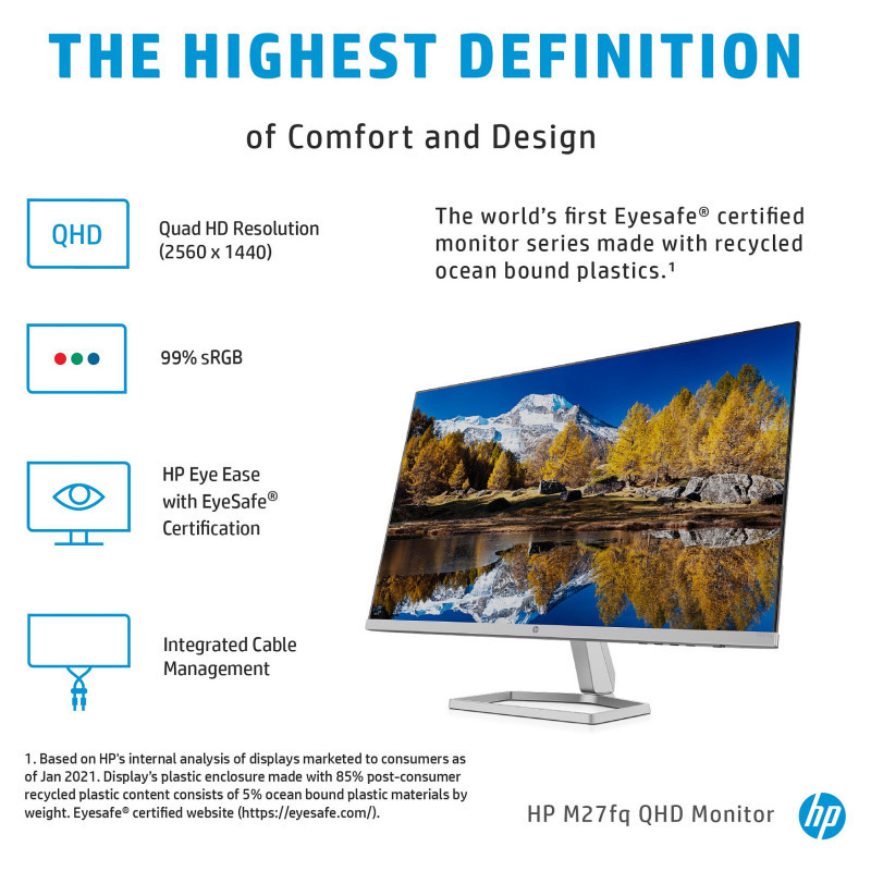 "HP M27fq QHD Monitor. Display diagonal: 68.6 cm (27""), Display resolution: 2560 x 1440 pixels, HD type: Quad HD, Display technology: LCD, Display surface: Matt, Response time: 5 ms, Native aspect ratio: 16:9, Viewing angle, horizontal: 178°, Viewing angle, vertical: 178°. Product colour: Silver"\n"The highest definition of comfort and design.