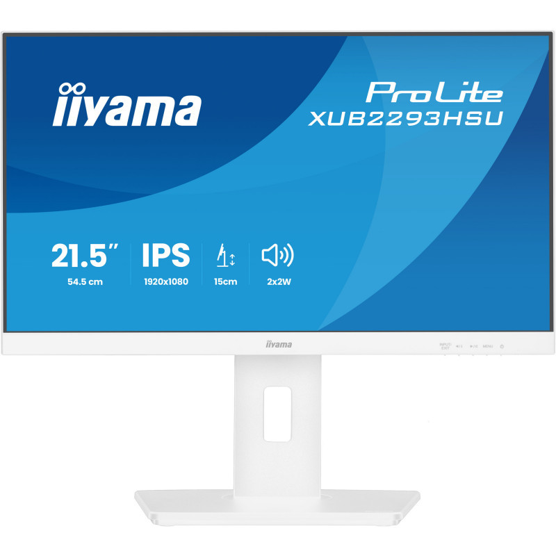 "iiyama ProLite XUB2293HSU-W7. Display diagonal: 54.6 cm (21.5""), Display resolution: 1920 x 1080 pixels, HD type: Full HD, Display technology: LED, Display surface: Matt, Response time: 1 ms, Native aspect ratio: 16:9, Viewing angle, horizontal: 178°, Viewing angle, vertical: 178°. Built-in speaker(s). Built-in USB hub, USB hub version: 2.0. VESA mounting, Height adjustment. Product colour: White"\n"The ProLite XUB2293HSU is an excellent choice for professionals seeking a compact and high-performance monitor for multi-monitor setups and office work. Its sleek edge-to-edge design ensures seamless visuals, making it perfect for dual or triple screen configurations. With IPS panel technology, the XUB2293HSU delivers precise colour reproduction, wide viewing angles and excellent contrast and brightness. This makes it ideal for photo editing, design, and web content. A blue light reducer helps minimise eye strain, while the 150mm height-adjustable stand with tilt, swivel, and pivot offers optimal ergonomic comfort. Connectivity includes HDMI, DisplayPort, a 2-port USB hub, built-in speakers, and a headphone socket. Compact and feature-rich, it is designed to enhance comfort and productivity."