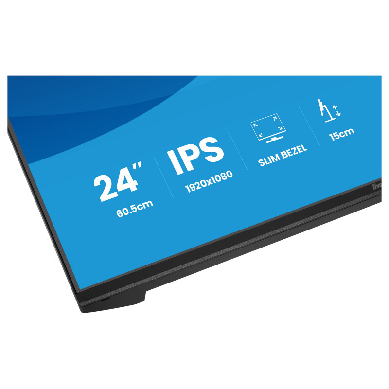 "iiyama ProLite XB2491H-B1. Display diagonal: 60.5 cm (23.8""), Display resolution: 1920 x 1080 pixels, HD type: Full HD, Display technology: LCD, Display surface: Matt, Native aspect ratio: 16:9, Viewing angle, horizontal: 178°, Viewing angle, vertical: 178°. VESA mounting, Height adjustment. Product colour: Black"\n"The ProLite XB2491H features a 24'' Full HD display with a sleek 4-side slim bezel design, helping you create a clean and modern multi-monitor workspace. The IPS panel delivers sharp detail, vivid colours and consistent brightness from all angles. With a fast 120Hz refresh rate, visuals remain smooth and responsive, whether you're working on complex tasks or enjoying multimedia. Flicker-free technology and a blue light reducer enhance eye comfort, especially during extended use. Its ergonomic stand offers 15cm of height adjustment along with tilt, swivel and pivot functions, so you can easily position the screen to suit your posture and stay comfortable throughout the day. A headphone socket provides convenient audio connectivity for private listening and online calls. With EPEAT Silver registration, TCO Certified compliance and an Energy Label C rating, the XB2491H supports both efficient work and responsible energy use."