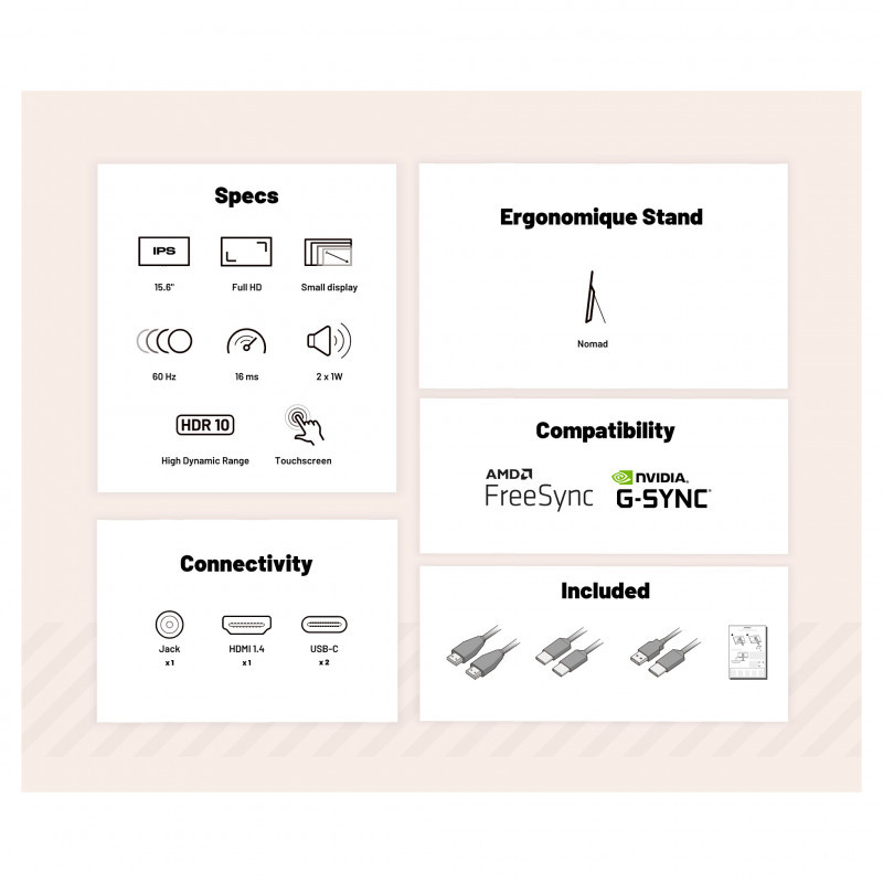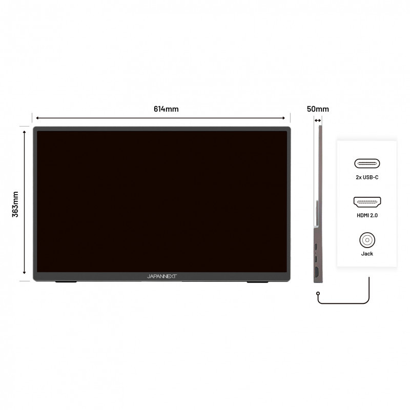 "JAPANNEXT JN-MD-I156FHDR-T. Display diagonal: 39.6 cm (15.6""), Display resolution: 1920 x 1080 pixels, HD type: Full HD, Display technology: LED, Display surface: Matt, Response time: 16 ms, Native aspect ratio: 16:9, Viewing angle, horizontal: 170°, Viewing angle, vertical: 170°. Built-in speaker(s). Product colour: Grey"\n