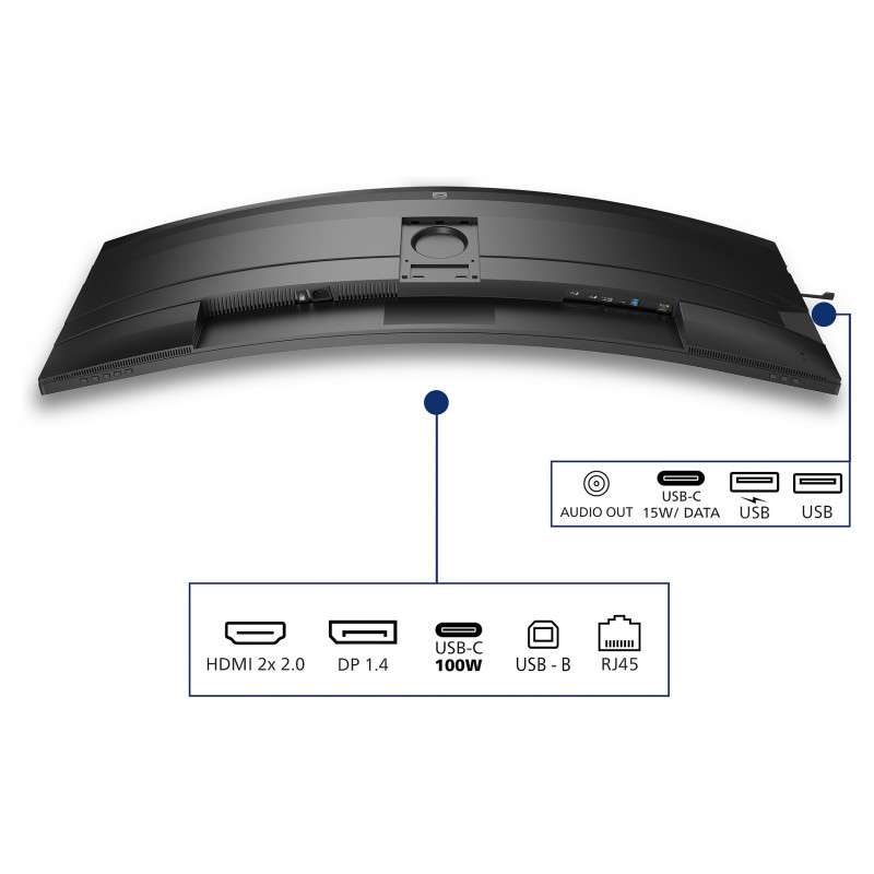 "Philips 5000 series 49B2U5900C/00. Display diagonal: 124 cm (48.8""), Display resolution: 5120 x 1440 pixels, HD type: Dual QHD, Display technology: LCD, Response time: 4 ms, Native aspect ratio: 32:9, Viewing angle, horizontal: 178°, Viewing angle, vertical: 178°. Built-in speaker(s). Built-in USB hub, USB hub version: 3.2 Gen 1 (3.1 Gen 1). VESA mounting, Height adjustment. Product colour: Black"\n"This 49-inch business monitor is made for efficiency. Its SuperWide screen, Smart KVM switch, and USB-C connectivity make teamwork and moving between tasks an easier feat."